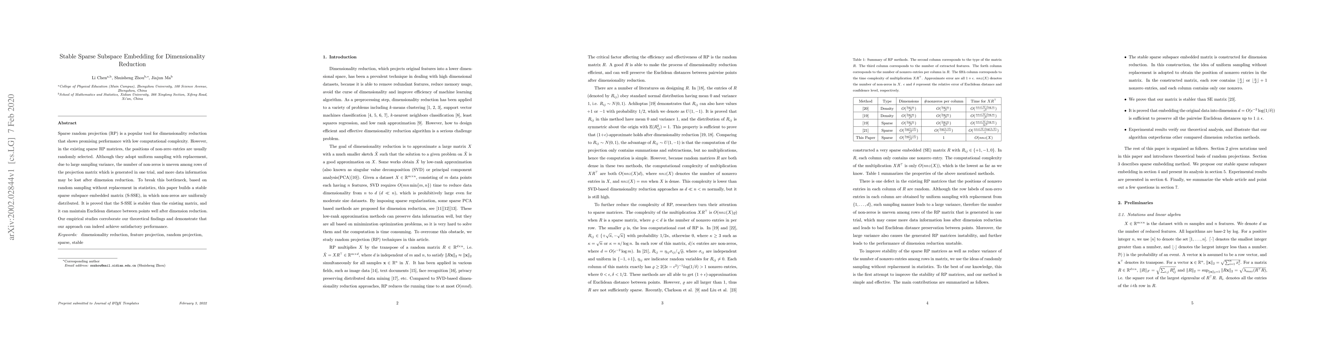 This paper proposes a stable sparse subspace embedding matrix (S-SSE) for dimensionality reduction, addressing the issue of uneven non-zero distribution in existing sparse random projection matrices. The S-SSE ensures uniform non-zero distribution, proving better stability and distance preservation after reduction, as confirmed by empirical studies.