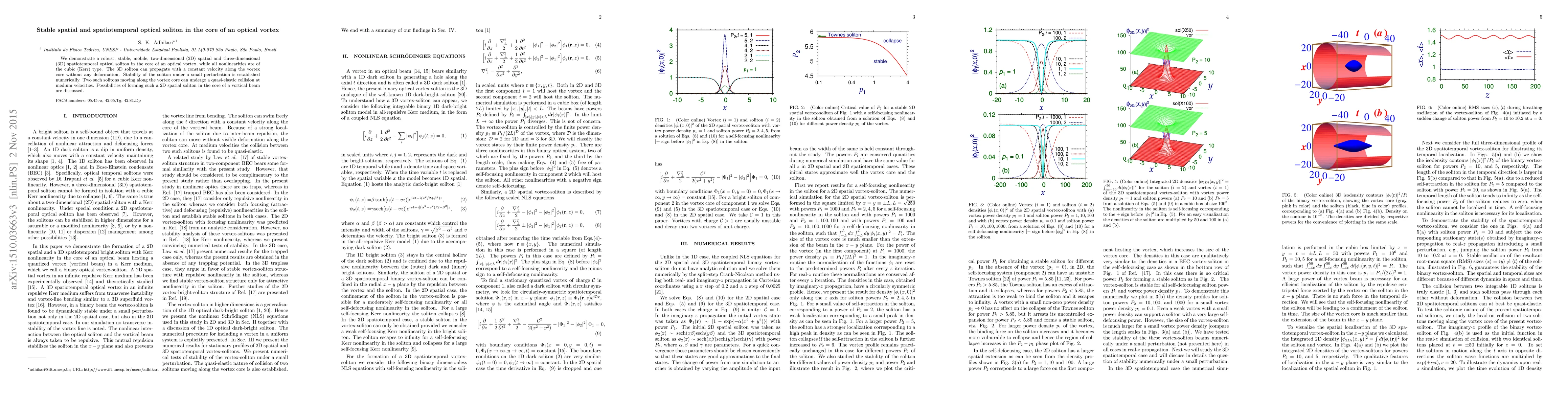 We demonstrate a robust, stable, mobile, two-dimensional (2D) spatial and three-dimensional (3D) spatiotemporal optical soliton in the core of an optical vortex, while all nonlinearities are of the cubic (Kerr) type. The 3D soliton can propagate with a constant velocity along the vortex core without any deformation. Stability of the soliton under a small perturbation is established numerically. Two such solitons moving along the vortex core can undergo a quasi-elastic collision at medium velocities. Possibilities of forming such a 2D spatial soliton in the core of a vortical beam are discussed.