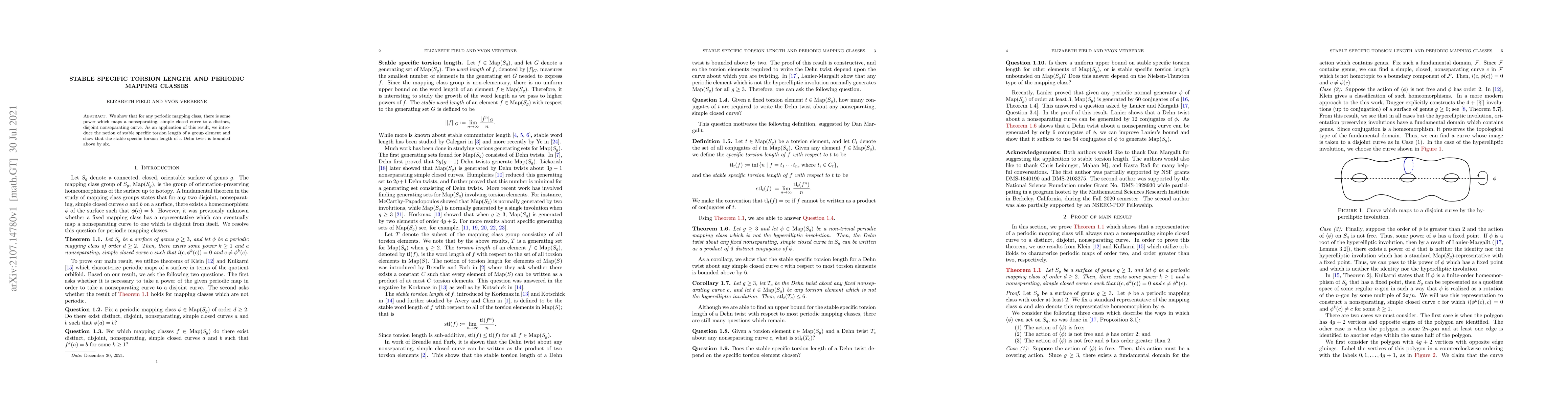 The paper establishes that a periodic mapping class raised to a certain power can map a nonseparating curve to a distinct, disjoint nonseparating curve. It also introduces stable specific torsion length for group elements, proving that the length for Dehn twists is bounded above by six.