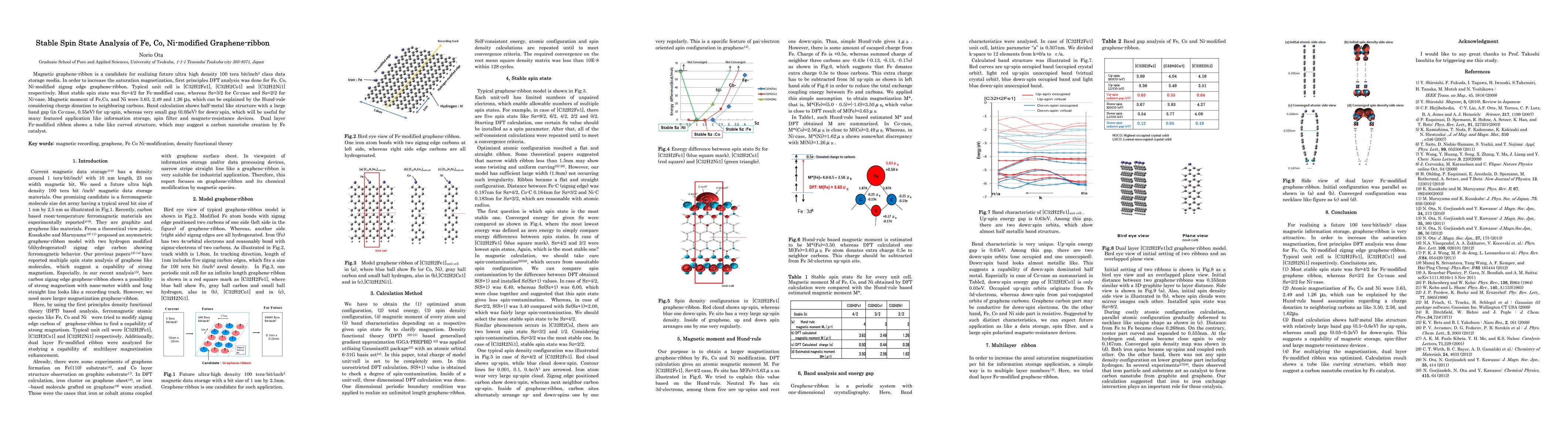 Magnetic graphene-ribbon is a candidate for realizing future ultra high density 100 tera bit/inch2 class data storage media. In order to increase the saturation magnetization, first principles DFT analysis was done for Fe, Co, Ni-modified zigzag edge graphene-ribbon. Typical unit cell is [C32H2Fe1], [C32H2Co1] and [C32H2Ni1] respectively. Most stable spin state was Sz=4/2 for Fe-modified case, whereas Sz=3/2 for Co-case and Sz=2/2 for Ni-case. Magnetic moment of Fe,Co, and Ni were 3.63, 2.49 and 1.26 {\mu}B, which can be explained by the Hund-rule considering charge donation to neighboring carbons. Band calculation shows half-metal like structure with a large band gap (in Co-case, 0.55eV) for up-spin, whereas very small gap (0.05eV) for down-spin, which will be useful for many featured application like information storage, spin filter and magneto-resistance devices. Dual layer Fe-modified ribbon shows a tube like curved structure, which may suggest a carbon nanotube creation by Fe catalyst.