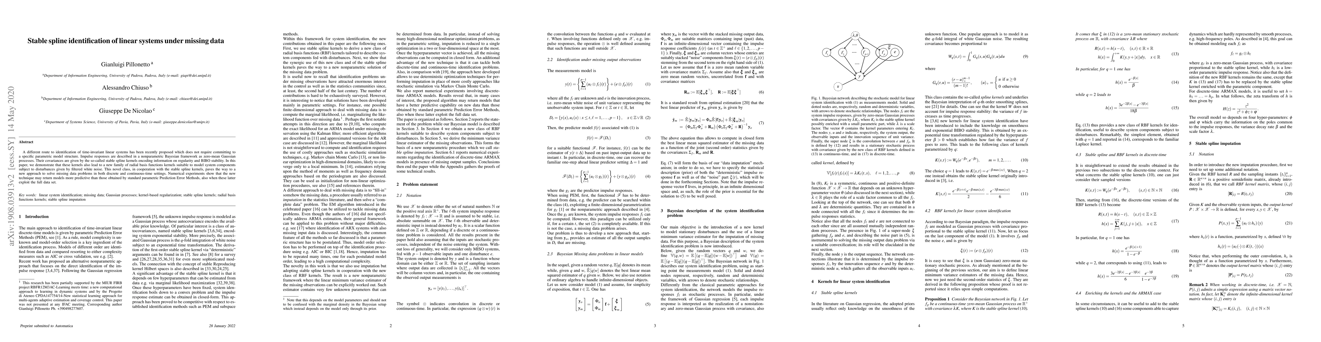 This paper proposes a novel nonparametric Bayesian approach for identifying time-invariant linear systems using stable spline kernels, which can handle missing data effectively. The stable spline kernels, combined with new radial basis function kernels, outperform standard parametric methods in predictive accuracy.