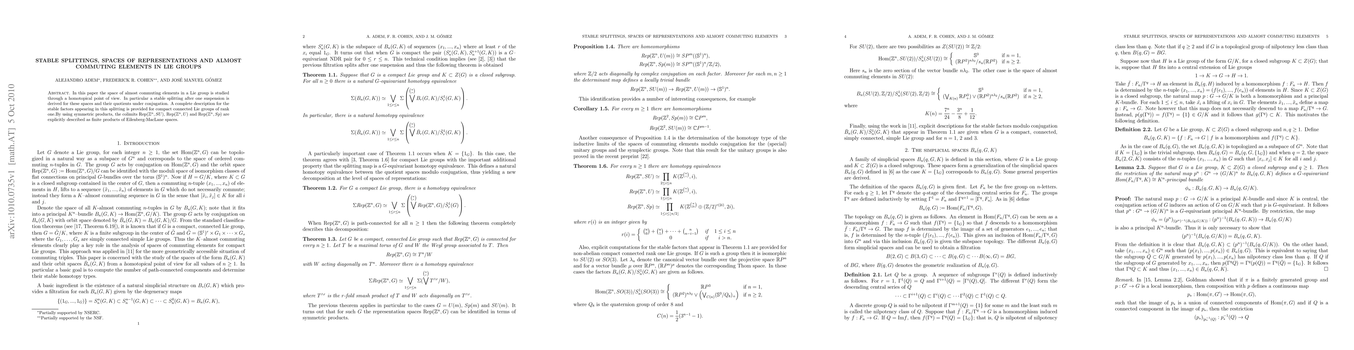 In this paper the space of almost commuting elements in a Lie group is studied through a homotopical point of view. In particular a stable splitting after one suspension is derived for these spaces and their quotients under conjugation. A complete description for the stable factors appearing in this splitting is provided for compact connected Lie groups of rank one.By using symmetric products, the colimits $\Rep(\Z^n, SU)$, $\Rep(\Z^n,U)$ and $\Rep(\Z^n, Sp)$ are explicitly described as finite products of Eilenberg-MacLane spaces.
