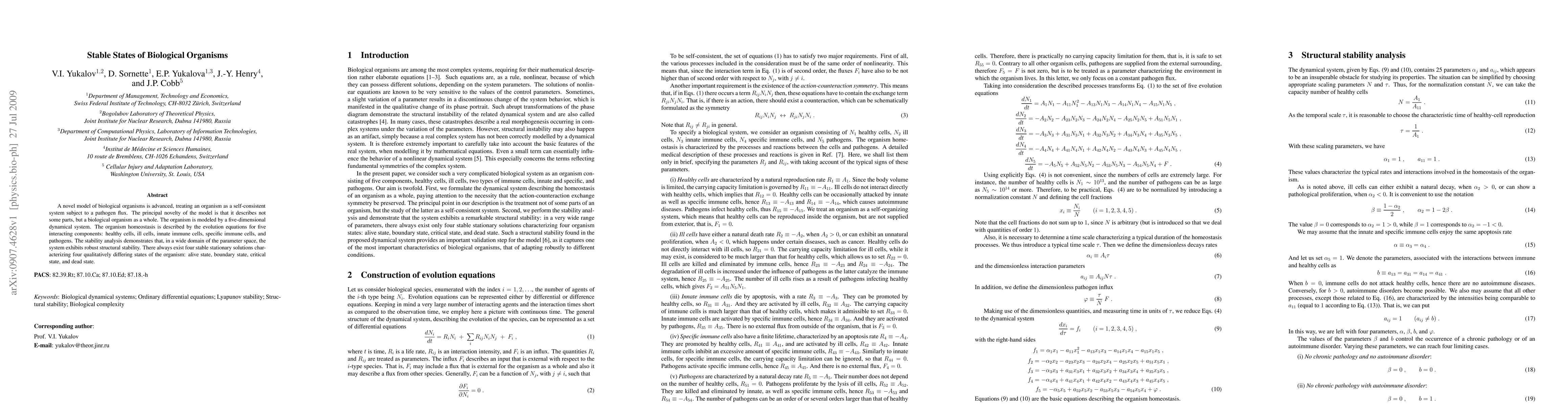 A novel model of biological organisms is advanced, treating an organism as a self-consistent system subject to a pathogen flux. The principal novelty of the model is that it describes not some parts, but a biological organism as a whole. The organism is modeled by a five-dimensional dynamical system. The organism homeostasis is described by the evolution equations for five interacting components: healthy cells, ill cells, innate immune cells, specific immune cells, and pathogens. The stability analysis demonstrates that, in a wide domain of the parameter space, the system exhibits robust structural stability. There always exist four stable stationary solutions characterizing four qualitatively differing states of the organism: alive state, boundary state, critical state, and dead state.