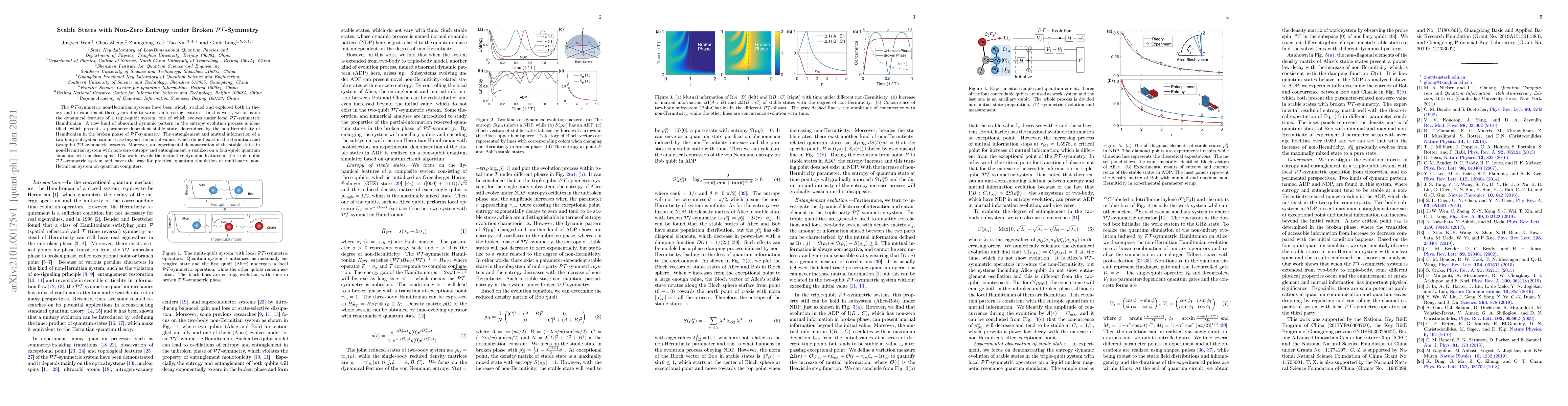 The $\mathcal{PT}$-symmetric non-Hermitian systems have been widely studied and explored both in theory and in experiment these years due to various interesting features. In this work, we focus on the dynamical features of a triple-qubit system, one of which evolves under local $\mathcal{PT}$-symmetric Hamiltonian. A new kind of abnormal dynamic pattern in the entropy evolution process is identified, which presents a parameter-dependent stable state, determined by the non-Hermiticity of Hamiltonian in the broken phase of $\mathcal{PT}$-symmetry. The entanglement and mutual information of a two-body subsystem can increase beyond the initial values, which do not exist in the Hermitian and two-qubit $\mathcal{PT}$-symmetric systems. Moreover, an experimental demonstration of the stable states in non-Hermitian system with non-zero entropy and entanglement is realized on a four-qubit quantum simulator with nuclear spins. Our work reveals the distinctive dynamic features in the triple-qubit $\mathcal{PT}$-symmetric system and paves the way for practical quantum simulation of multi-party non-Hermitian system on quantum computers.