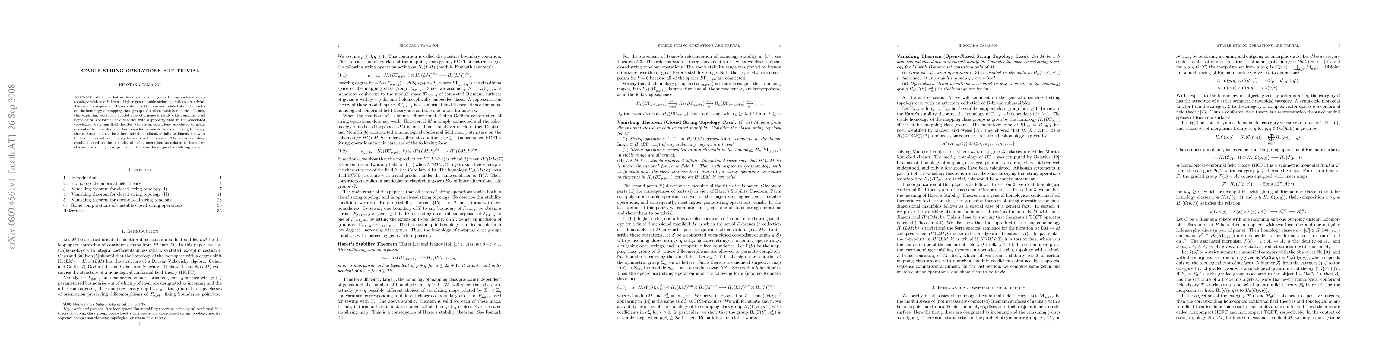 We show that in closed string topology and in open-closed string topology with one $D$-brane, higher genus stable string operations are trivial. This is a consequence of Harer's stability theorem and related stability results on the homology of mapping class groups of surfaces with boundaries. In fact, this vanishing result is a special case of a general result which applies to all homological conformal field theories with a property that in the associated topological quantum field theories, the string operations associated to genus one cobordisms with one or two boundaries vanish. In closed string topology, the base manifold can be either finite dimensional, or infinite dimensional with finite dimensional cohomology for its based loop space. The above vanishing result is based on the triviality of string operations associated to homology classes of mapping class groups which are in the image of stabilizing maps.
