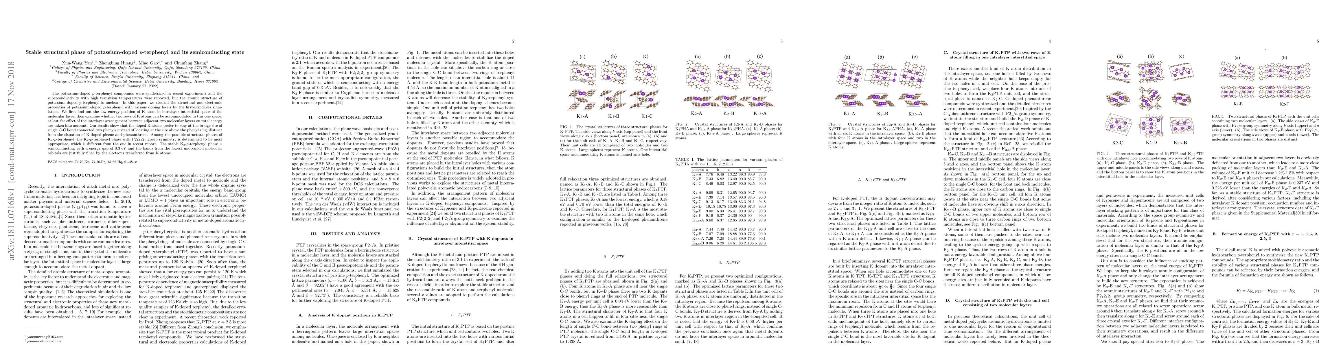 This paper investigates the structural and electronic properties of potassium-doped p-terphenyl using first-principles simulations. It finds that K atoms prefer the bridge site of C-C bonds, leading to a stable K2-p-terphenyl phase with P212121 symmetry, which is semiconducting with a 0.3 eV band gap.