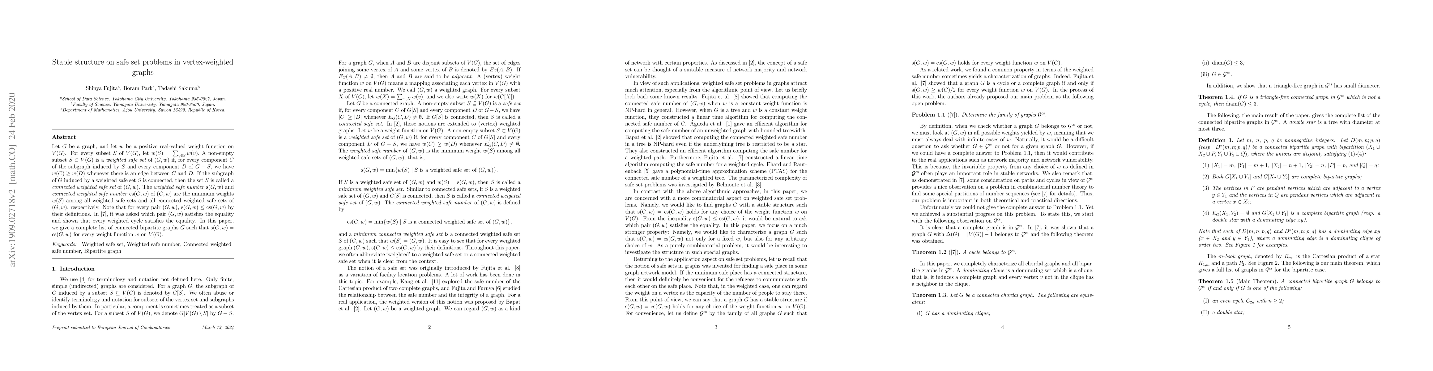 This paper investigates the properties of weighted safe sets in vertex-weighted graphs, identifying conditions under which the weighted safe number equals the connected weighted safe number. It provides a complete list of connected bipartite graphs where this equality holds for any weight function.