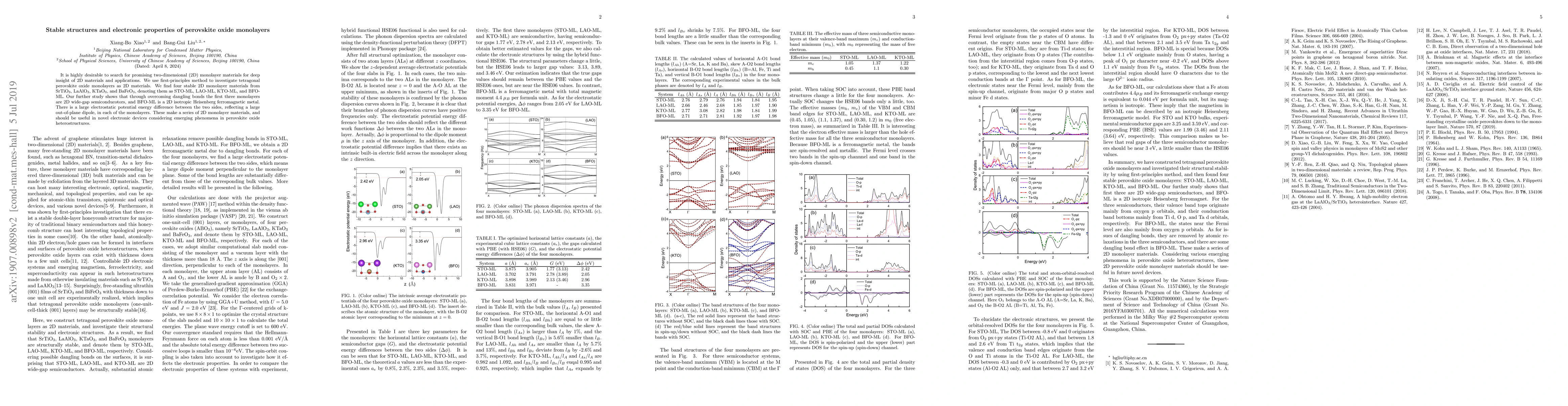 The paper investigates stable tetragonal perovskite oxide monolayers using first-principles methods, identifying four stable 2D materials: STO-ML, LAO-ML, KTO-ML, and BFO-ML. It finds that the first three are wide-gap semiconductors, while BFO-ML is a ferromagnetic metal, highlighting potential applications in electronic devices.