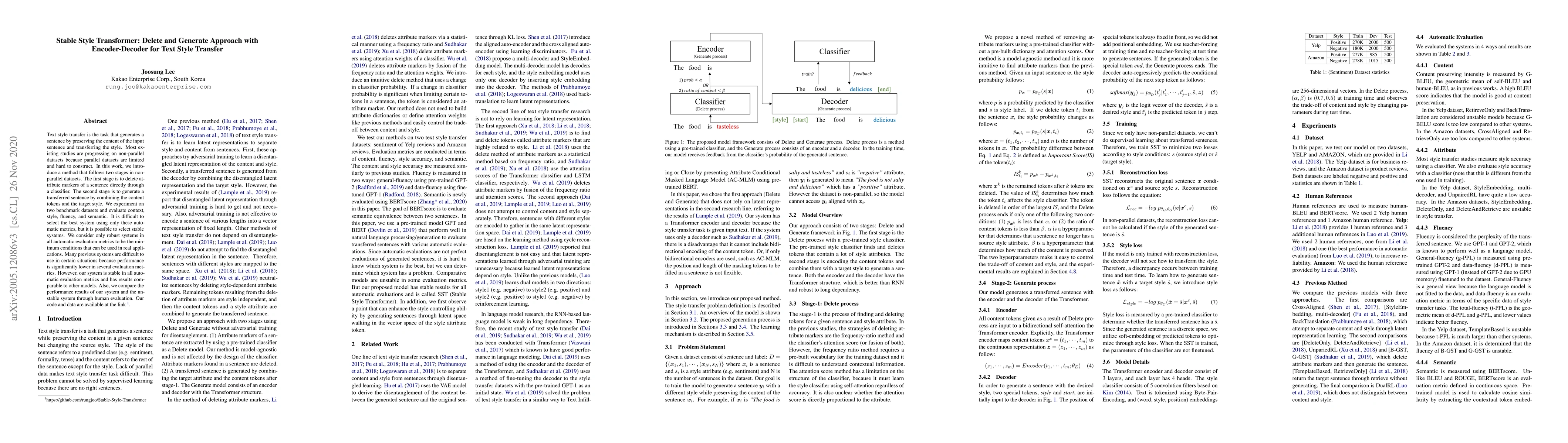 This paper proposes a two-stage method for text style transfer using non-parallel datasets, involving deletion of style markers followed by generation of a new sentence with the target style. The system demonstrates stability across various automatic evaluation metrics and outperforms unstable systems in human evaluations.