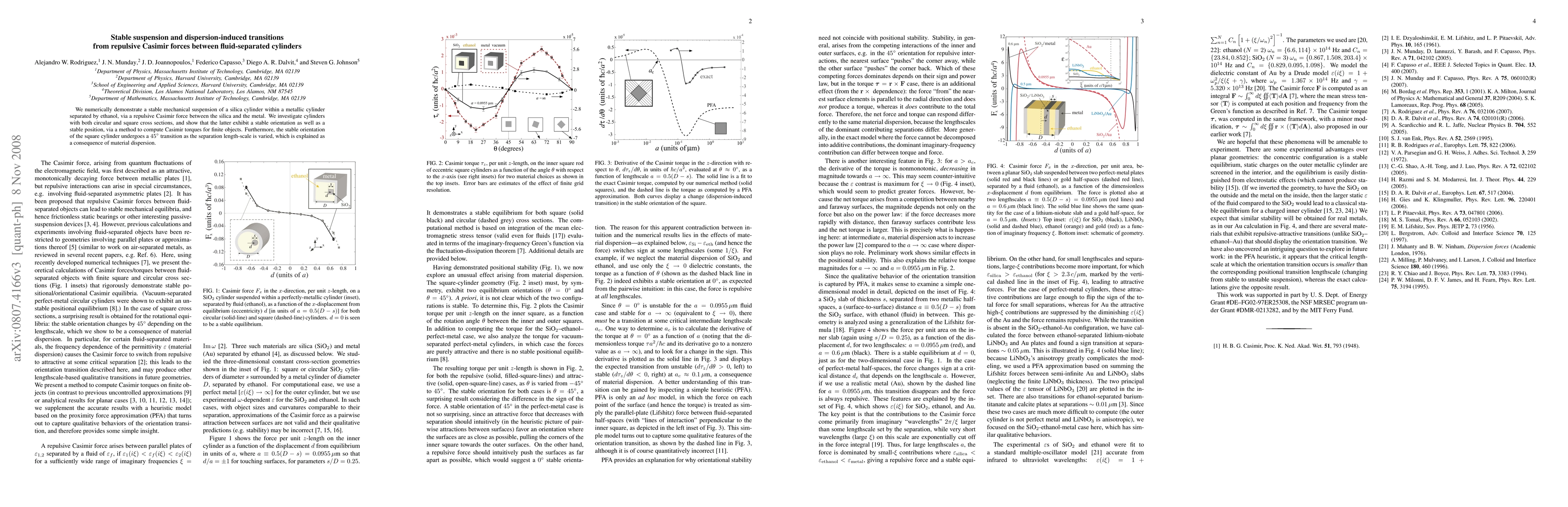 Using an exact numerical method for finite nonplanar objects, we demonstrate a stable mechanical suspension of a silica cylinder within a metallic cylinder separated by ethanol, via a repulsive Casimir force between the silica and the metal. We investigate cylinders with both circular and square cross sections, and show that the latter exhibit a stable orientation as well as a stable position, via a method to compute Casimir torques for finite objects. Furthermore, the stable orientation of the square cylinder is shown to undergo an unusual 45 degrees transition as a function of the separation lengthscale, which is explained as a consequence of material dispersion.