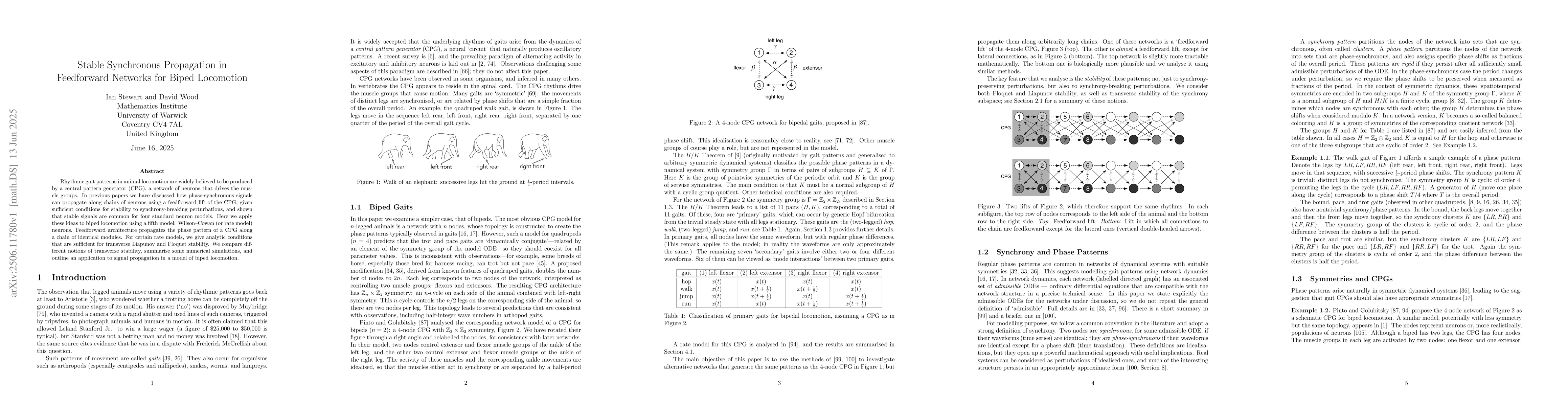 Rhythmic gait patterns in animal locomotion are widely believed to be produced by a central pattern generator (CPG), a network of neurons that drives the muscle groups. In previous papers we have discussed how phase-synchronous signals can propagate along chains of neurons using a feedforward lift of the CPG, given sufficient conditions for stability to synchrony-breaking perturbations, and shown that stable signals are common for four standard neuron models. Here we apply these ideas to biped locomotion using a fifth model: Wilson-Cowan (or rate model) neurons. Feedforward architecture propagates the phase pattern of a CPG along a chain of identical modules. For certain rate models, we give analytic conditions that are sufficient for transverse Liapunov and Floquet stability. We compare different notions of transverse stability, summarise some numerical simulations, and outline an application to signal propagation in a model of biped locomotion.