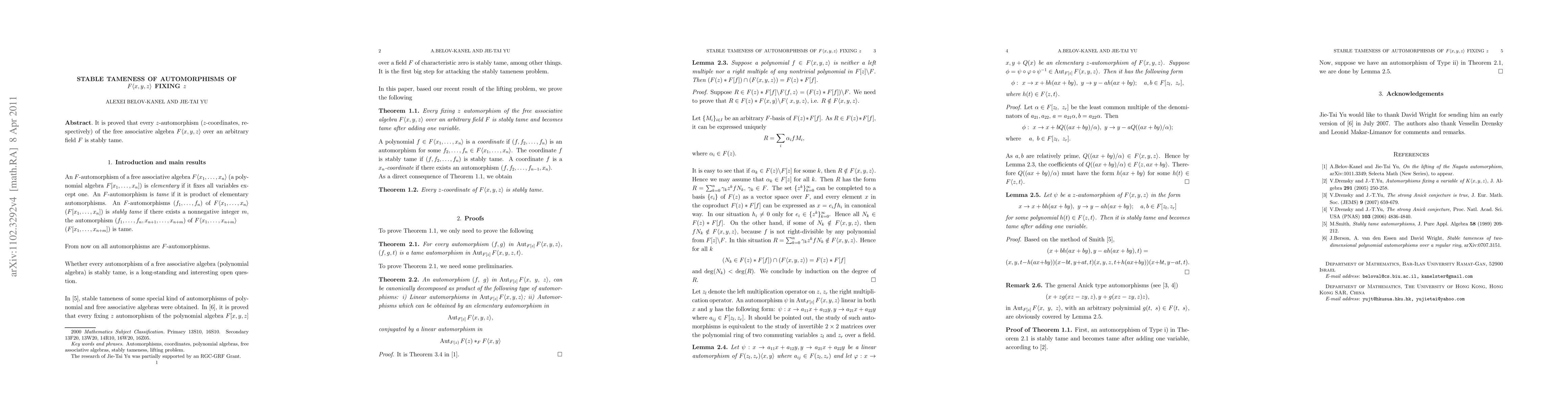 Summary: The paper demonstrates that every automorphism of the free associative algebra F<x,y,z> that fixes the z-coordinate is stably tame, showing stability under extensions and transformations.