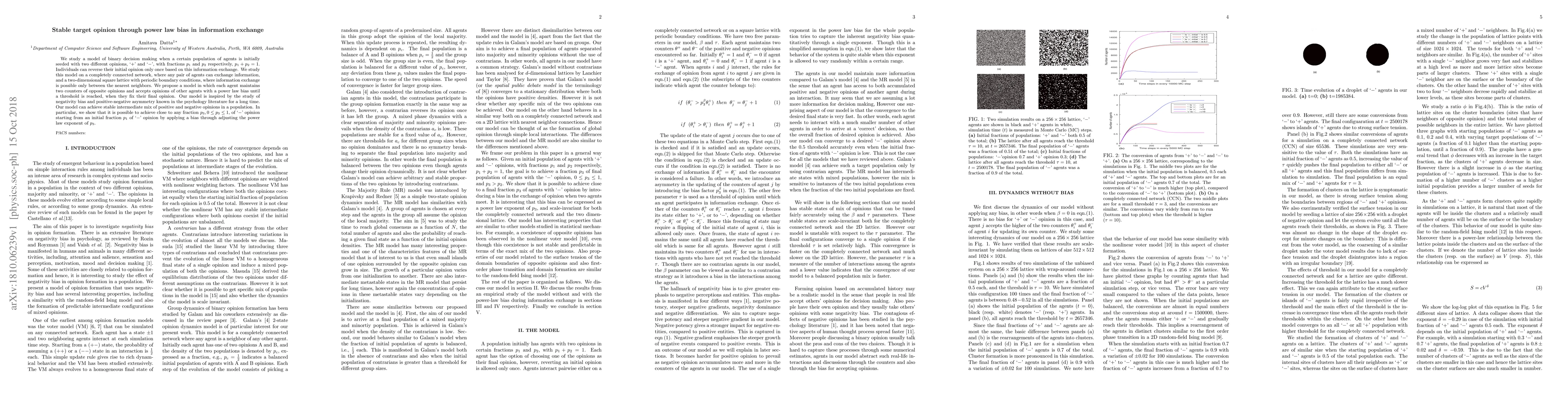 We study a model of binary decision making when a certain population of agents is initially seeded with two different opinions, `$+$' and `$-$', with fractions $p_1$ and $p_2$ respectively, $p_1+p_2=1$. Individuals can reverse their initial opinion only once based on this information exchange. We study this model on a completely connected network, where any pair of agents can exchange information, and a two-dimensional square lattice with periodic boundary conditions, where information exchange is possible only between the nearest neighbors. We propose a model in which each agent maintains two counters of opposite opinions and accepts opinions of other agents with a power law bias until a threshold is reached, when they fix their final opinion. Our model is inspired by the study of negativity bias and positive-negative asymmetry known in the psychology literature for a long time. Our model can achieve stable intermediate mix of positive and negative opinions in a population. In particular, we show that it is possible to achieve close to any fraction $p_3, 0\leq p_3\leq 1$, of `$-$' opinion starting from an initial fraction $p_1$ of `$-$' opinion by applying a bias through adjusting the power law exponent of $p_3$.