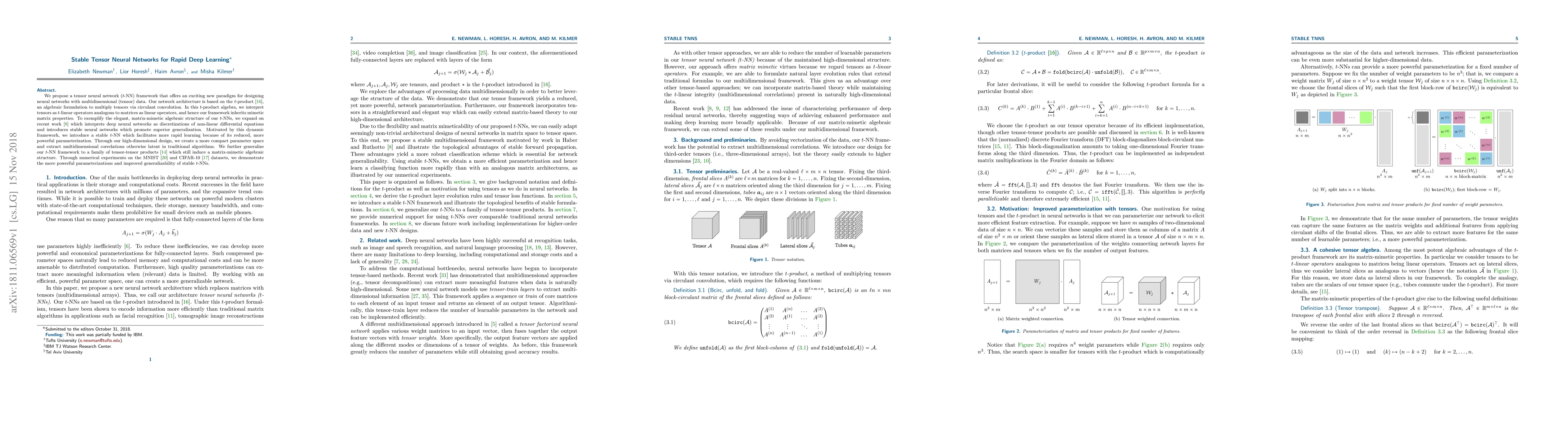 This paper introduces a stable tensor neural network ($t$-NN) framework based on tensor algebra, which utilizes the $t$-product for efficient tensor multiplication. The proposed $t$-NNs demonstrate superior generalization and rapid learning due to their compact parameter space and ability to extract multidimensional correlations. Numerical experiments on MNIST and CIFAR-10 datasets validate the enhanced performance of these stable tensor neural networks.