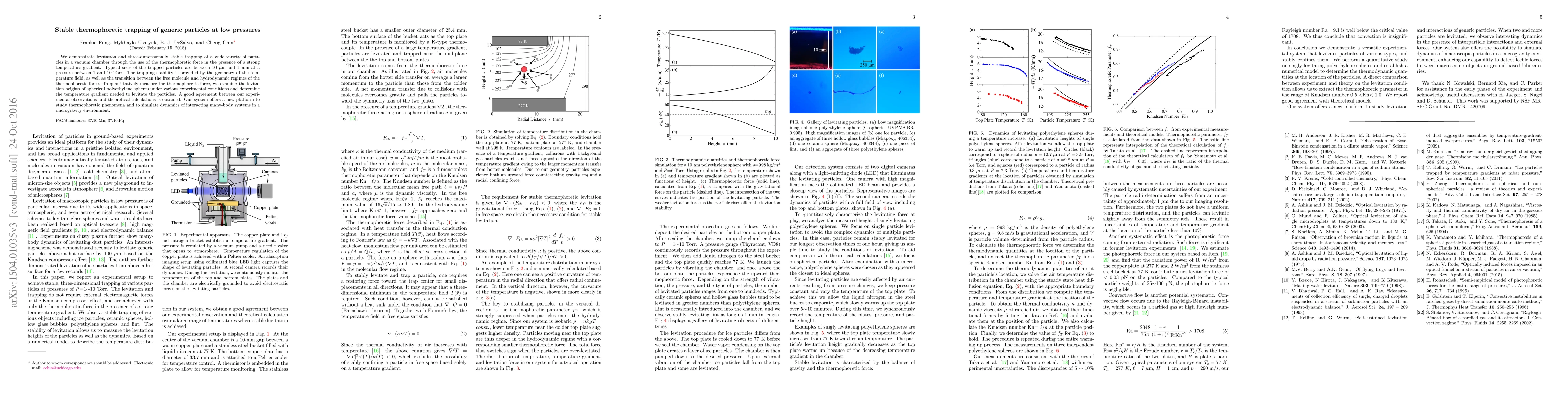 This paper demonstrates stable thermophoretic trapping of diverse particles in a vacuum chamber using a strong temperature gradient, achieving levitation heights that match theoretical calculations. The method provides a platform for studying thermophoretic effects and simulating many-body dynamics in microgravity environments.