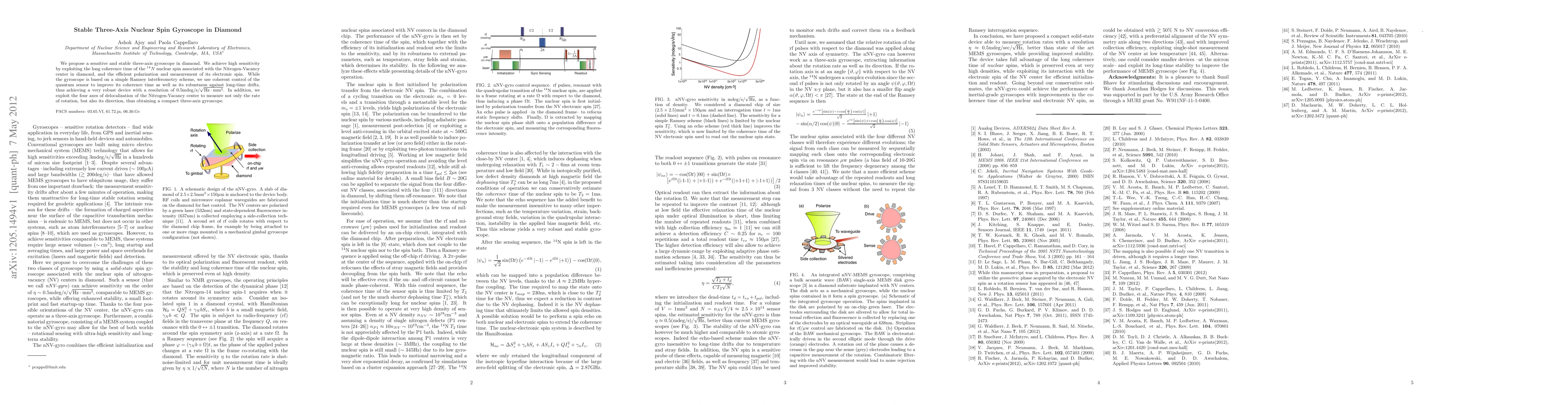 This paper proposes a stable and sensitive three-axis gyroscope in diamond, utilizing the long coherence time of N14 nuclear spin linked to Nitrogen-Vacancy centers. The gyroscope achieves high resolution and robustness through coherent control and measures both rotation rate and direction.
