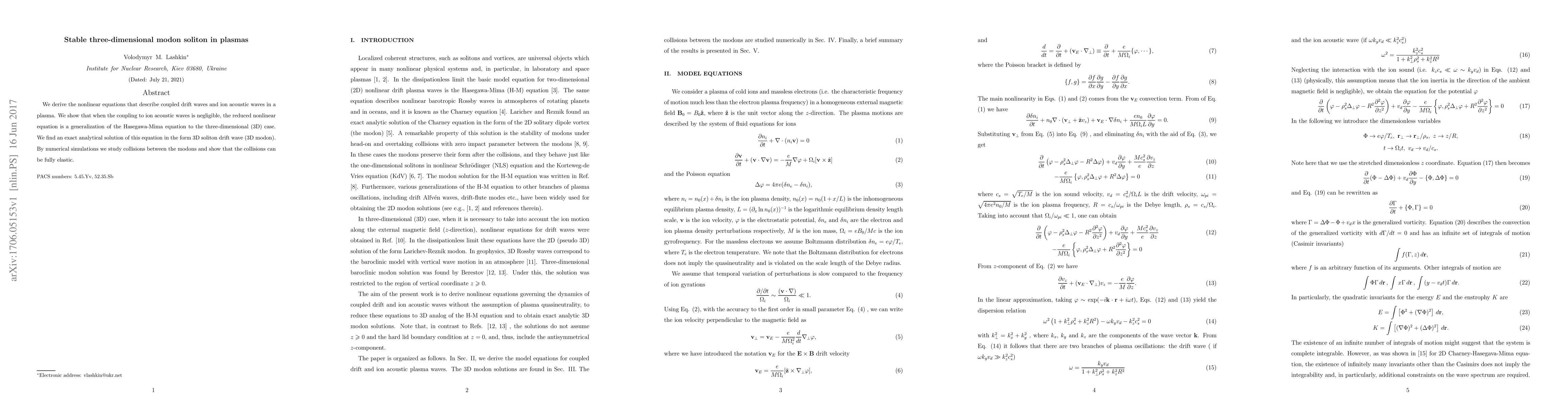 We derive the nonlinear equations that describe coupled drift waves and ion acoustic waves in a plasma. We show that when the coupling to ion acoustic waves is negligible, the reduced nonlinear equation is a generalization of the Hasegawa-Mima equation to the three-dimensional (3D) case. We find an exact analytical solution of this equation in the form 3D soliton drift wave (3D modon). By numerical simulations we study collisions between the modons and show that the collisions can be fully elastic.