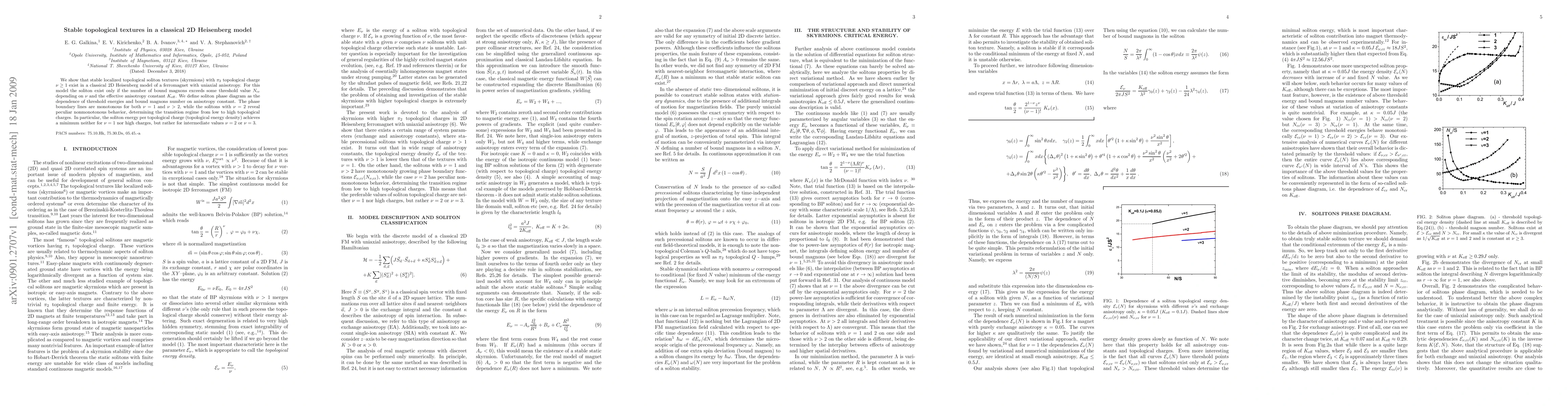Researchers found stable topological textures, known as skyrmions, in a 2D Heisenberg model of ferromagnetism with a specific threshold value for bound magnons to exist. The soliton's energy density achieves a minimum at intermediate topological charges.