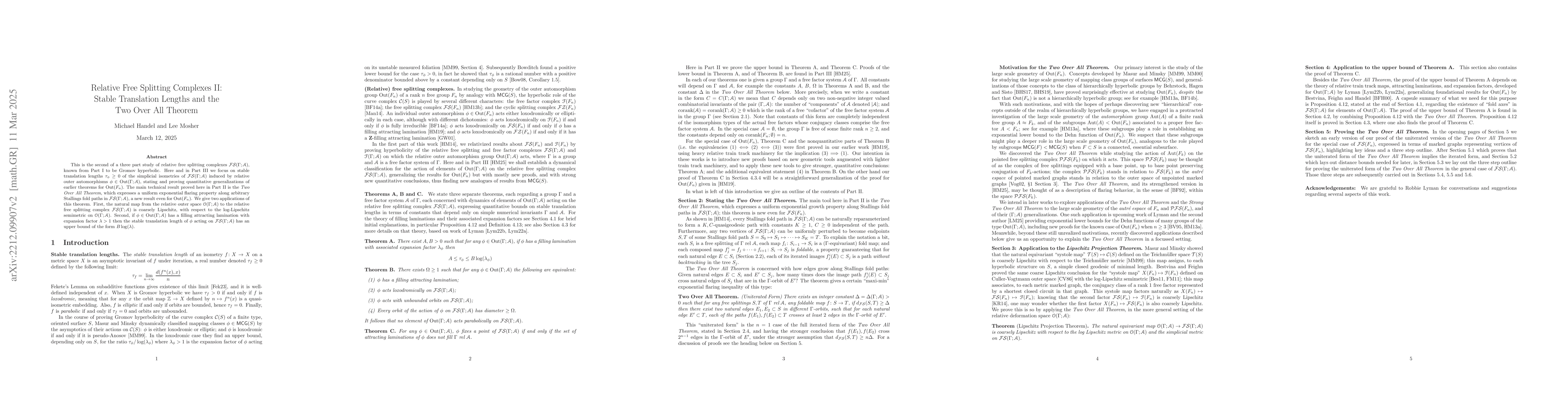This paper proves the Two Over All Theorem for the outer automorphism group acting on the relative free splitting complex, establishing a uniform exponential growth property. It also shows the coarse Lipschitz nature of the map from the outer space to the free splitting complex and provides an upper bound for the stable translation length of certain automorphisms.