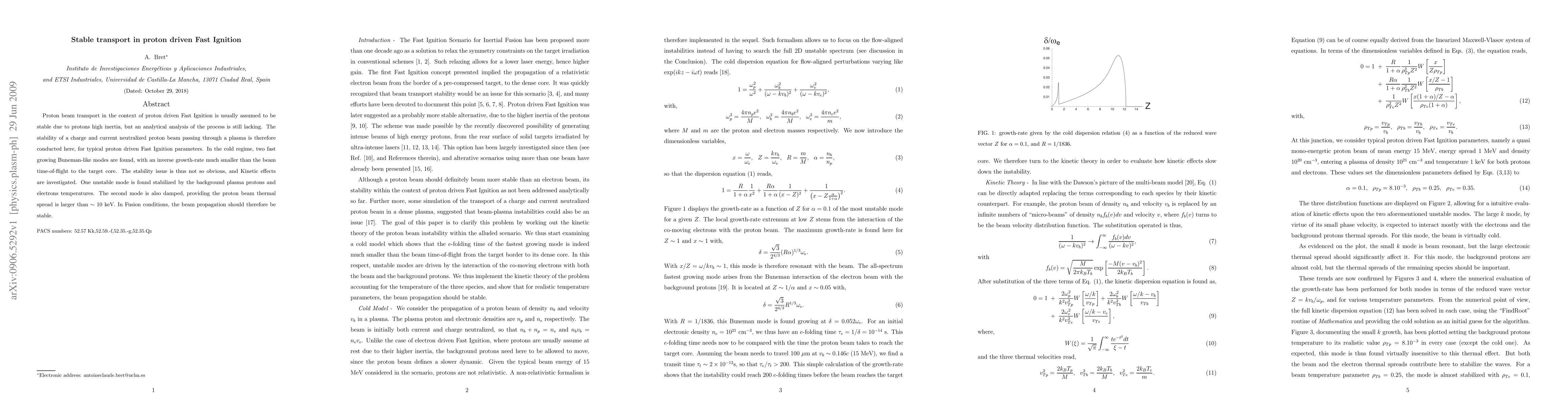 This paper investigates the stability of proton beams in proton-driven Fast Ignition, finding that while high proton inertia suggests stability, analytical analysis reveals two unstable modes. Kinetic effects stabilize these modes, with the second mode requiring a thermal spread larger than 10 keV, ensuring beam stability under fusion conditions.