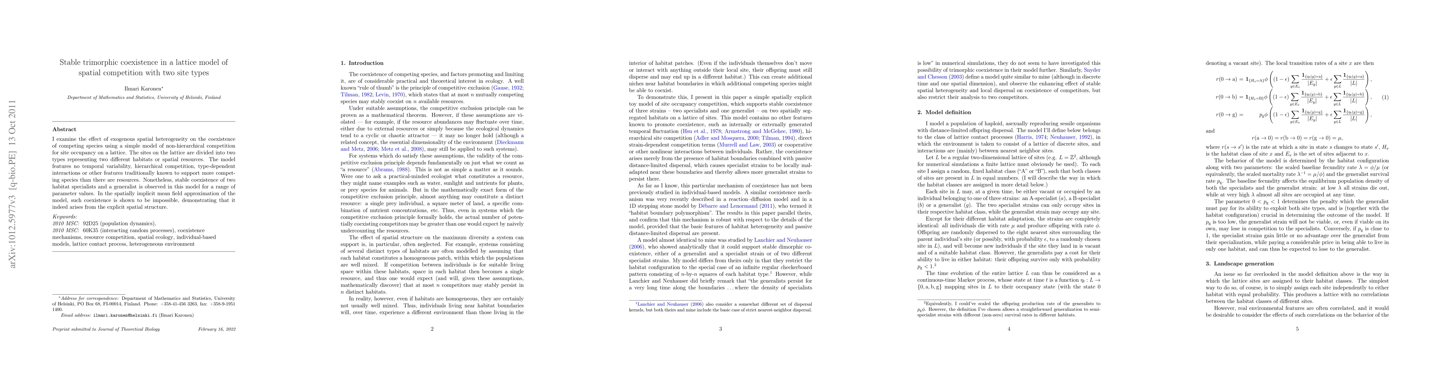 This paper explores a lattice model of spatial competition where two types of sites represent different habitats, revealing stable trimorphic coexistence among two habitat specialists and a generalist despite the absence of temporal variability and hierarchical competition. The spatial structure, rather than mean field approximations, facilitates this coexistence.