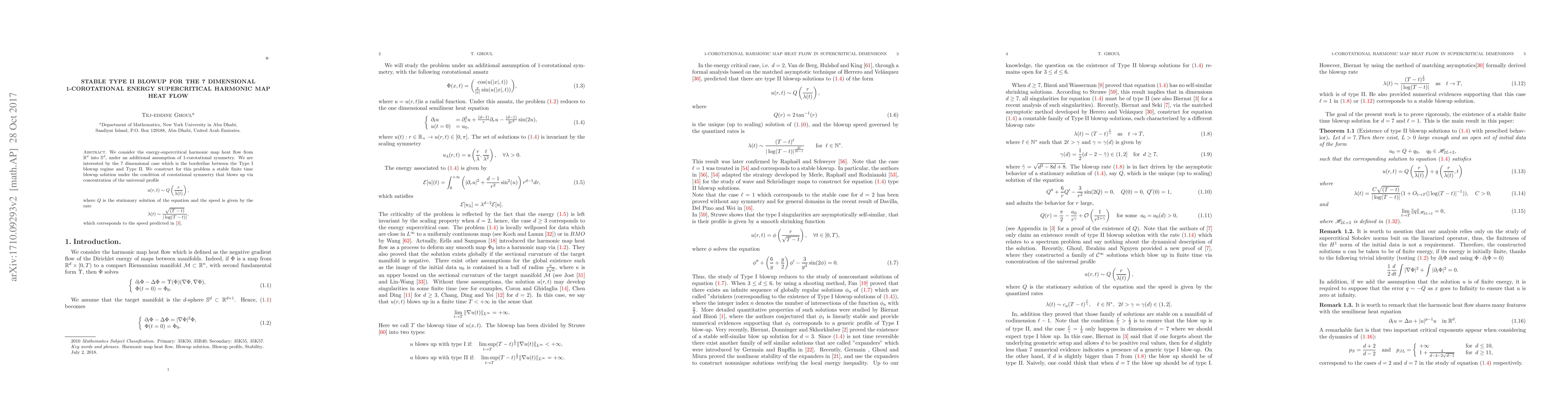 We consider the energy-supercritical harmonic map heat flow from $\mathbb{R}^d$ into $\mathbb{S}^d$, under an additional assumption of 1-corotational symmetry. We are interested by the 7 dimensional case which is the borderline between the Type I blowup regime. We construct for this problem a stable finite time blowup solution under the condition of corotational symmetry that blows up via concentration of the universal profile $$u(r,t) \sim Q\left(\frac{r}{\lambda(t)}\right),$$ where $Q$ is the stationary solution of the equation and the speed is given by the rate $$\lambda(t) \sim \frac{\sqrt{(T-t)}}{|\log(T-t)|},$$ which corresponds to the speed predicted by Biernat.