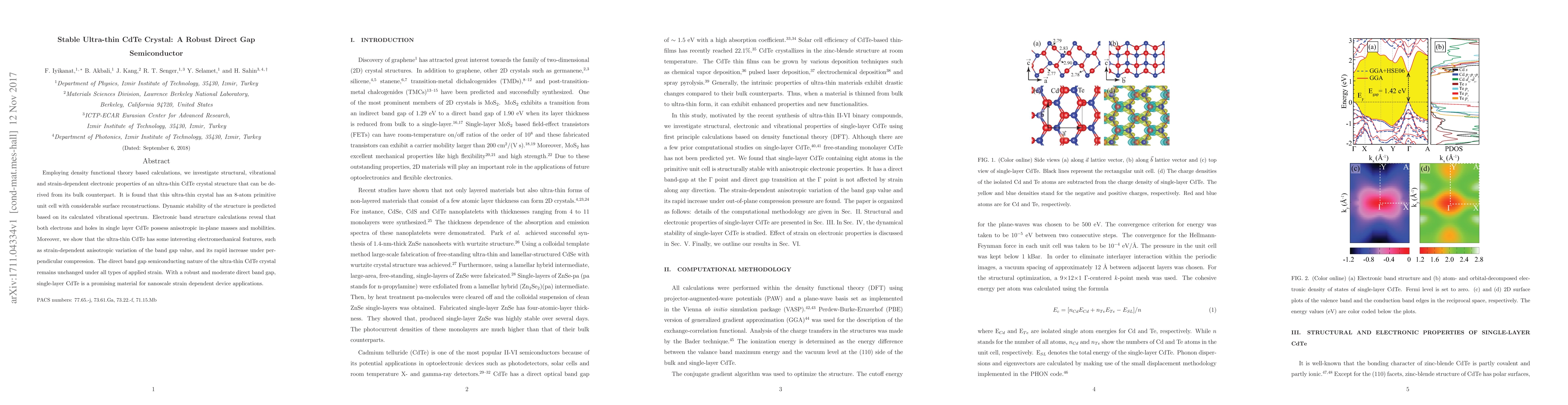 This study investigates the structural, vibrational, and electronic properties of ultra-thin CdTe crystals using density functional theory. The findings reveal that single-layer CdTe maintains its direct band gap and exhibits anisotropic electronic properties, making it a promising material for nanoscale strain-dependent devices.