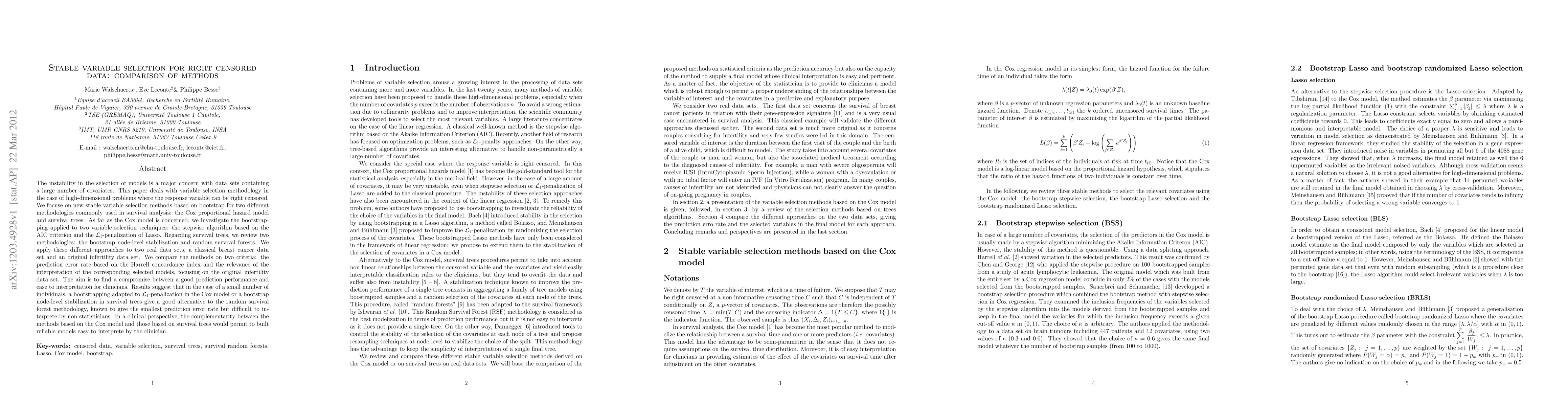The instability in the selection of models is a major concern with data sets containing a large number of covariates. This paper deals with variable selection methodology in the case of high-dimensional problems where the response variable can be right censored. We focuse on new stable variable selection methods based on bootstrap for two methodologies: the Cox proportional hazard model and survival trees. As far as the Cox model is concerned, we investigate the bootstrapping applied to two variable selection techniques: the stepwise algorithm based on the AIC criterion and the L1-penalization of Lasso. Regarding survival trees, we review two methodologies: the bootstrap node-level stabilization and random survival forests. We apply these different approaches to two real data sets. We compare the methods on the prediction error rate based on the Harrell concordance index and the relevance of the interpretation of the corresponding selected models. The aim is to find a compromise between a good prediction performance and ease to interpretation for clinicians. Results suggest that in the case of a small number of individuals, a bootstrapping adapted to L1-penalization in the Cox model or a bootstrap node-level stabilization in survival trees give a good alternative to the random survival forest methodology, known to give the smallest prediction error rate but difficult to interprete by non-statisticians. In a clinical perspective, the complementarity between the methods based on the Cox model and those based on survival trees would permit to built reliable models easy to interprete by the clinician.