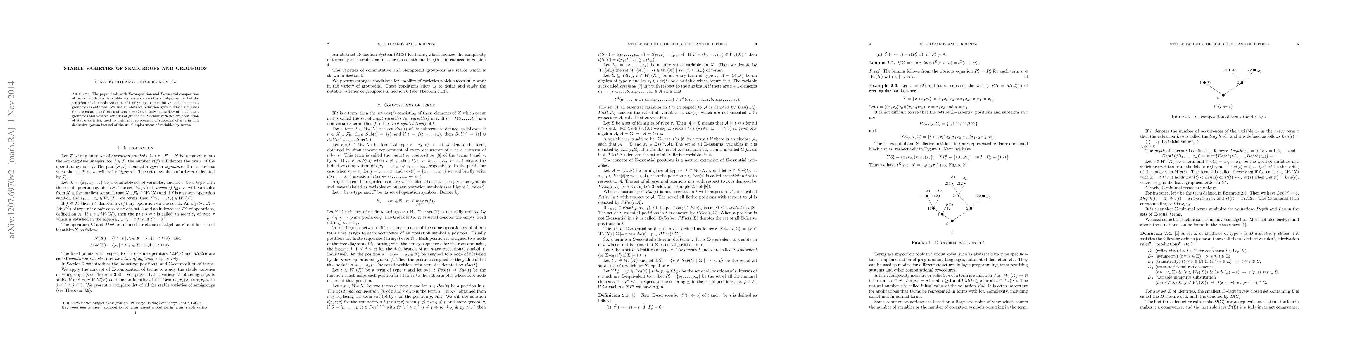 This paper explores $\Sigma$-composition and $\Sigma$-essential composition of terms to define stable and s-stable varieties of algebras, providing a comprehensive description of stable varieties for semigroups and commutative and idempotent groupoids. An abstract reduction system is employed to study the variety of idempotent groupoids and s-stable varieties, focusing on replacing subterms in deductive systems instead of traditional variable substitution.