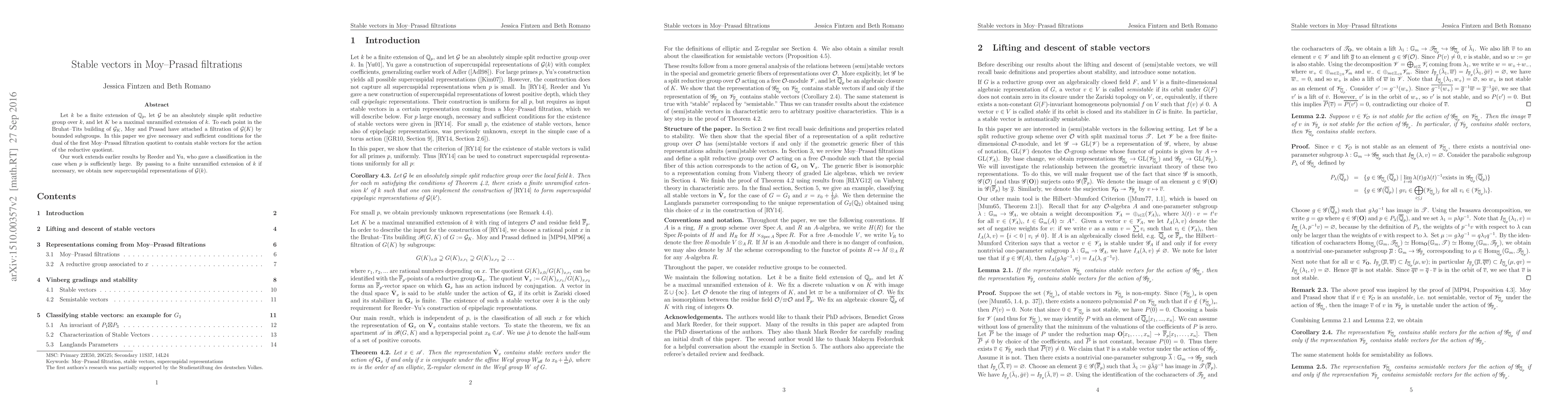 The paper extends earlier results by Reeder and Yu, using Moy-Prasad filtrations and analyzing necessary and sufficient conditions for the dual of the first Moy-Prasad filtration quotient to contain stable vectors for the action of the reductive quotient.