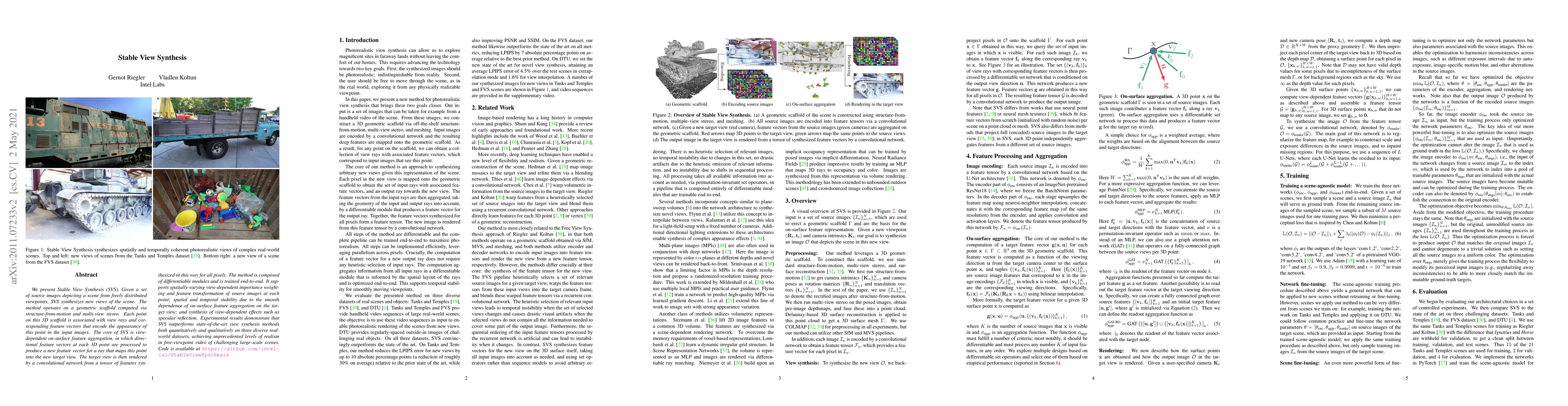Stable View Synthesis (SVS) synthesizes new views from a set of source images using a geometric scaffold and view-dependent feature aggregation. It outperforms existing methods, achieving high realism in free-viewpoint video, and is trained end-to-end with differentiable modules.