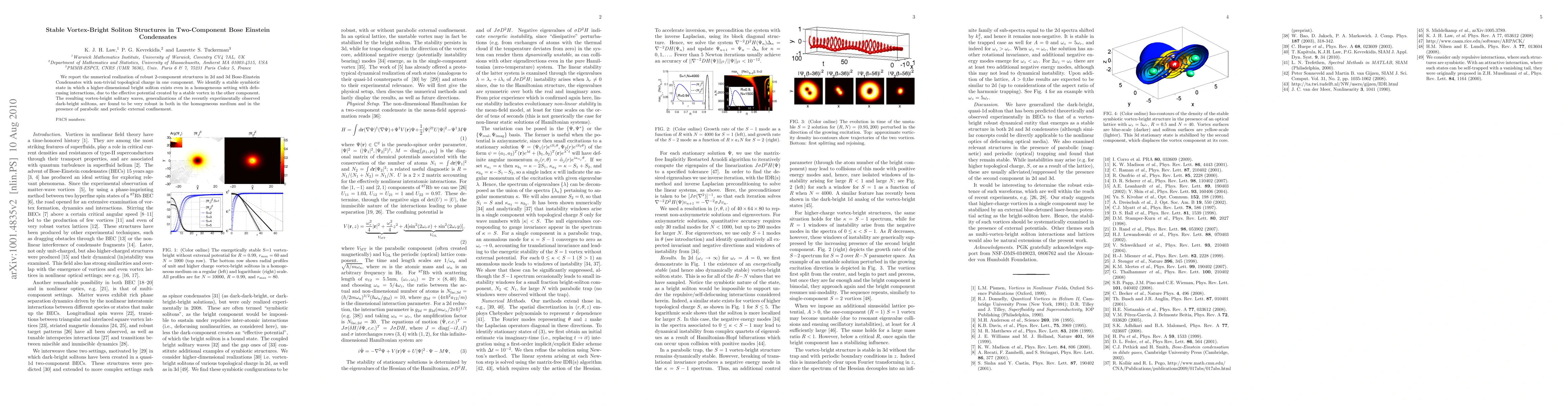 We report the numerical realization and demonstration of robustness of certain 2-component structures in Bose-Einstein Condensates in 2 and 3 spatial dimensions with non-trivial topological charge in one of the components. In particular, we identify a stable symbiotic state in which a higher-dimensional bright soliton exists even in a homogeneous setting with defocusing interactions, as a result of the effective potential created by a stable vortex in the other component. The resulting vortex-bright solitary waves, which naturally generalize the recently experimentally observed dark-bright solitons, are examined both in the homogeneous medium and in the presence of parabolic and periodic external confinement and are found to be very robust.