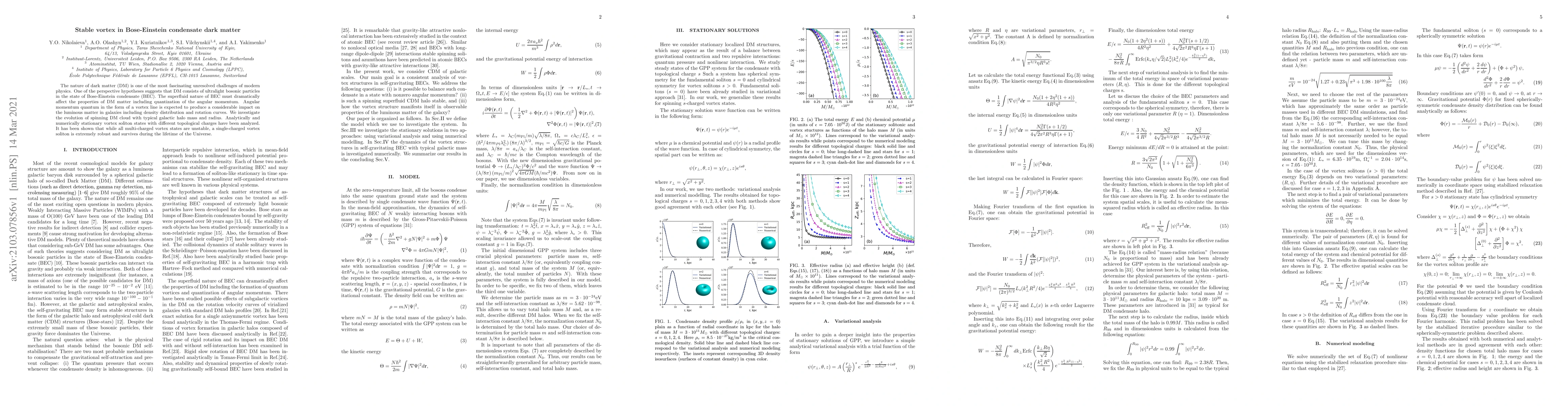 The nature of dark matter (DM) is one of the most fascinating unresolved challenges of modern physics. One of the perspective hypotheses suggests that DM consists of ultralight bosonic particles in the state of Bose-Einstein condensate (BEC). The superfluid nature of BEC must dramatically affect the properties of DM matter including quantization of the angular momentum. Angular momentum quantum in the form of a vortex line is expected to produce a considerable impact on the luminous matter in galaxies including density distribution and rotation curves. We investigate the evolution of spinning DM cloud with typical galactic halo mass and radius. Analytically and numerically stationary vortex soliton states with different topological charges have been analyzed. It has been shown that while all multi-charged vortex states are unstable, a single-charged vortex soliton is extremely robust and survives during the lifetime of the Universe.