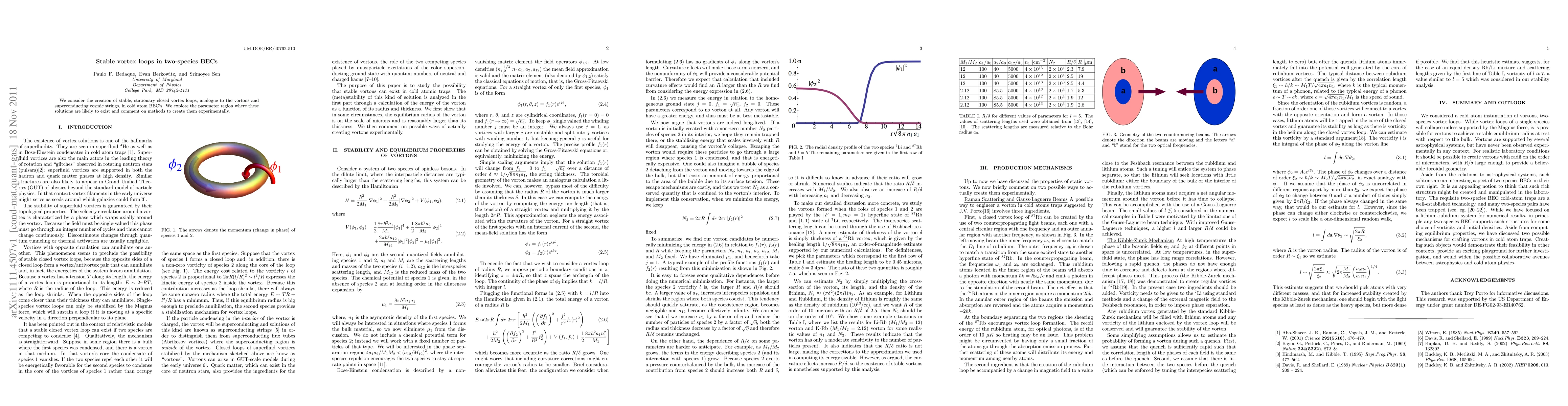 We consider the creation of stable, stationary closed vortex loops, analogue to the vortons and superconducting cosmic strings, in cold atom BEC's. We explore the parameter region where these solutions are likely to exist and comment on methods to create them experimentally.