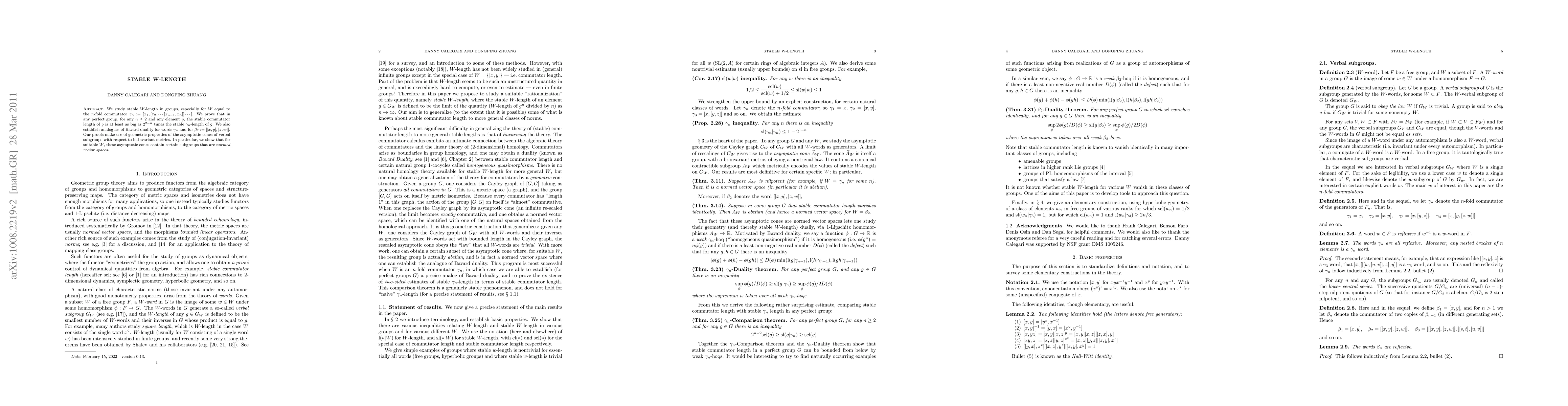 This paper investigates stable W-length in groups, focusing on the n-fold commutator gamma_n. It proves that in perfect groups, the stable commutator length of any element g is at least 2^{2-n} times its stable gamma_n-length for n ≥ 2. The study also establishes analogues of Bavard duality for gamma_n and beta_2, utilizing geometric properties of asymptotic cones of verbal subgroups.
