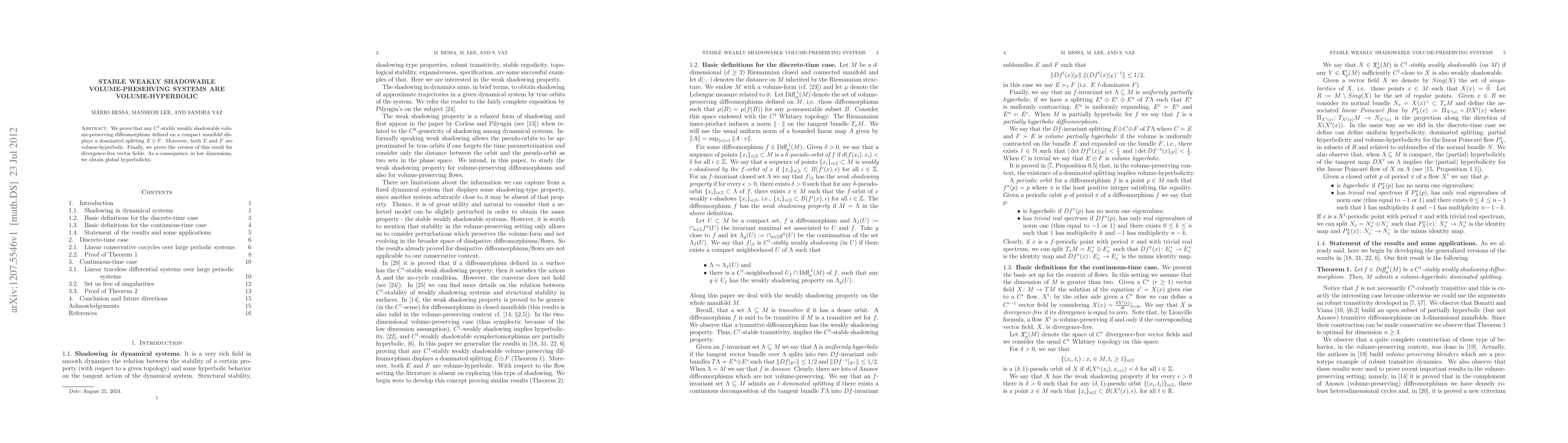 This paper demonstrates that C1-stably weakly shadowable volume-preserving diffeomorphisms on compact manifolds exhibit a dominated splitting into volume-hyperbolic subspaces, leading to global hyperbolicity in low dimensions. The result also extends to divergence-free vector fields.
