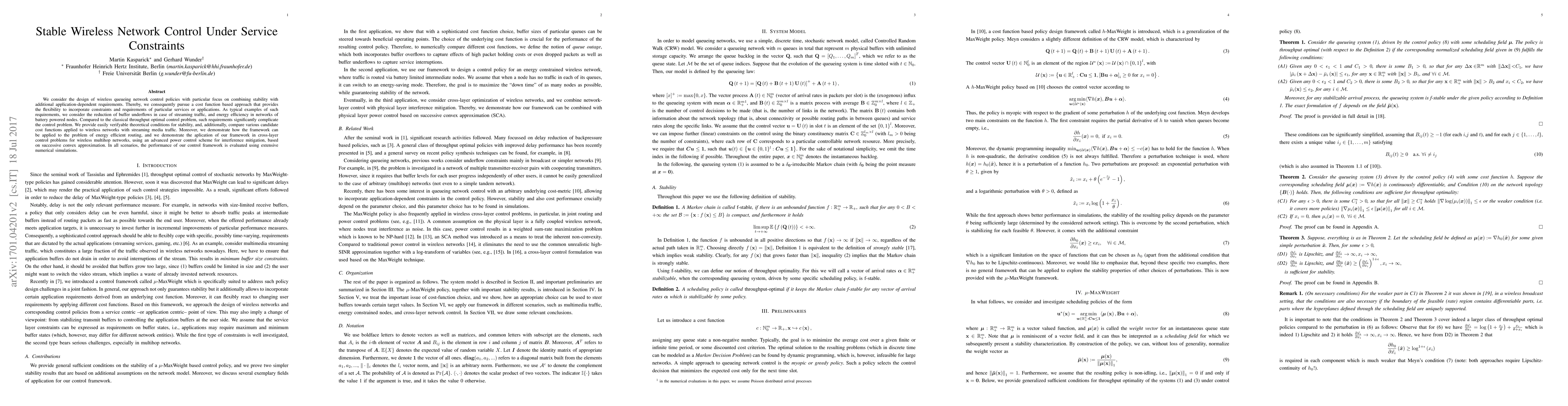 We consider the design of wireless queueing network control policies with particular focus on combining stability with additional application-dependent requirements. Thereby, we consequently pursue a cost function based approach that provides the flexibility to incorporate constraints and requirements of particular services or applications. As typical examples of such requirements, we consider the reduction of buffer underflows in case of streaming traffic, and energy efficiency in networks of battery powered nodes. Compared to the classical throughput optimal control problem, such requirements significantly complicate the control problem. We provide easily verifyable theoretical conditions for stability, and, additionally, compare various candidate cost functions applied to wireless networks with streaming media traffic. Moreover, we demonstrate how the framework can be applied to the problem of energy efficient routing, and we demonstrate the aplication of our framework in cross-layer control problems for wireless multihop networks, using an advanced power control scheme for interference mitigation, based on successive convex approximation. In all scenarios, the performance of our control framework is evaluated using extensive numerical simulations.