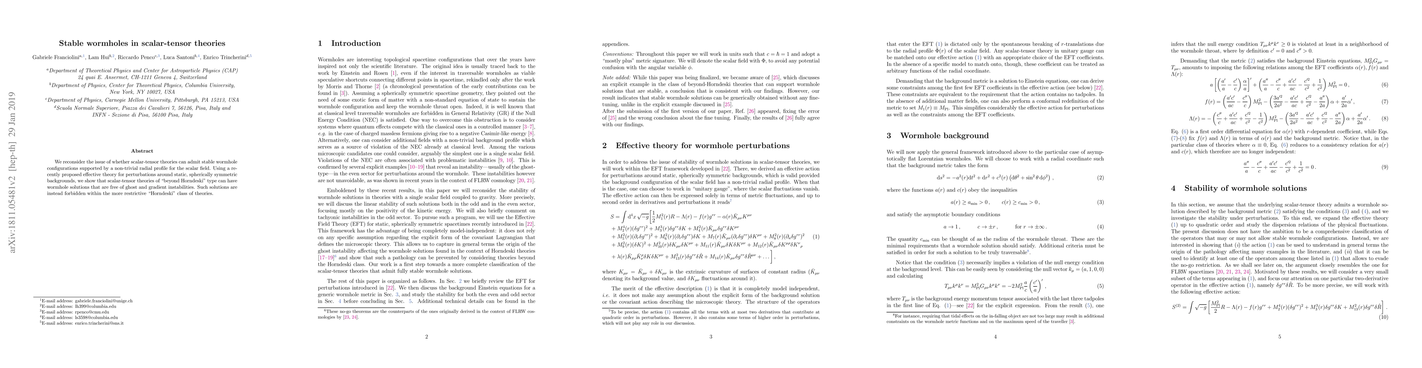We reconsider the issue of whether scalar-tensor theories can admit stable wormhole configurations supported by a non-trivial radial profile for the scalar field. Using a recently proposed effective theory for perturbations around static, spherically symmetric backgrounds, we show that scalar-tensor theories of "beyond Horndeski" type can have wormhole solutions that are free of ghost and gradient instabilities. Such solutions are instead forbidden within the more restrictive "Horndeski" class of theories.