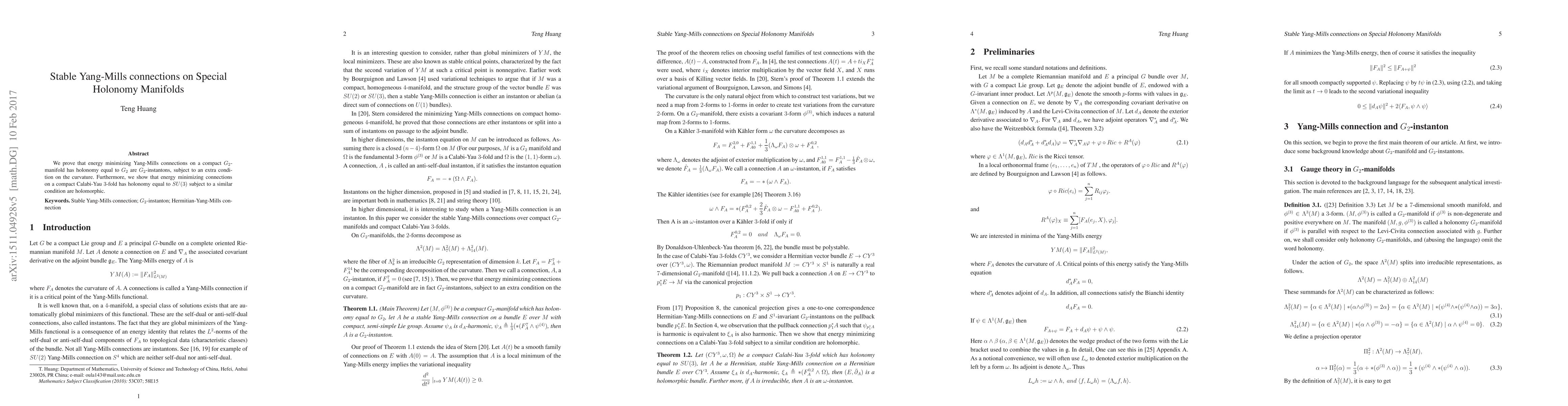 We prove that energy minimizing Yang-Mills connections on a compact $G_{2}$-manifold has holonomy equal to $G_{2}$ are $G_{2}$-instantons, subject to an extra condition on the curvature. Furthermore, we show that energy minimizing connections on a compact Calabi-Yau $3$-fold has holonomy equal to $SU(3)$ subject to a similar condition are holomorphic.