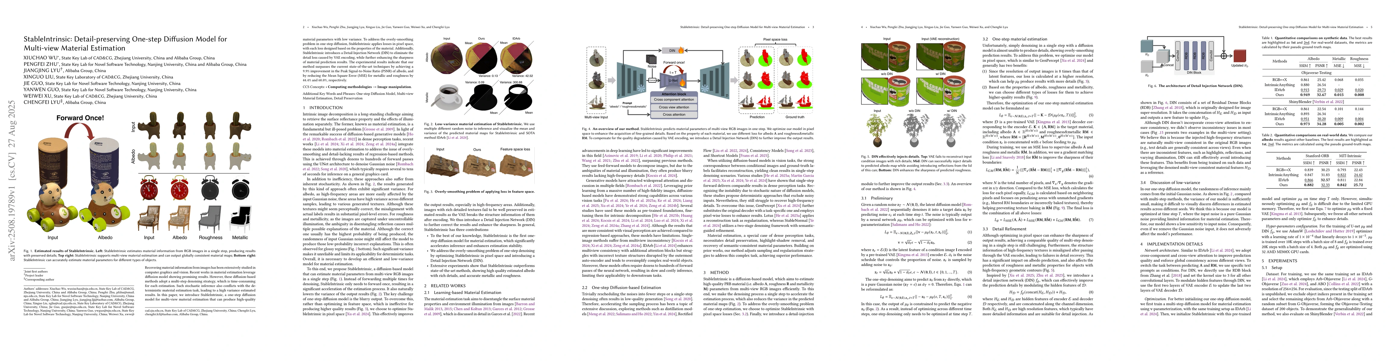 Recovering material information from images has been extensively studied in computer graphics and vision. Recent works in material estimation leverage diffusion model showing promising results. However, these diffusion-based methods adopt a multi-step denoising strategy, which is time-consuming for each estimation. Such stochastic inference also conflicts with the deterministic material estimation task, leading to a high variance estimated results. In this paper, we introduce StableIntrinsic, a one-step diffusion model for multi-view material estimation that can produce high-quality material parameters with low variance. To address the overly-smoothing problem in one-step diffusion, StableIntrinsic applies losses in pixel space, with each loss designed based on the properties of the material. Additionally, StableIntrinsic introduces a Detail Injection Network (DIN) to eliminate the detail loss caused by VAE encoding, while further enhancing the sharpness of material prediction results. The experimental results indicate that our method surpasses the current state-of-the-art techniques by achieving a $9.9\%$ improvement in the Peak Signal-to-Noise Ratio (PSNR) of albedo, and by reducing the Mean Square Error (MSE) for metallic and roughness by $44.4\%$ and $60.0\%$, respectively.