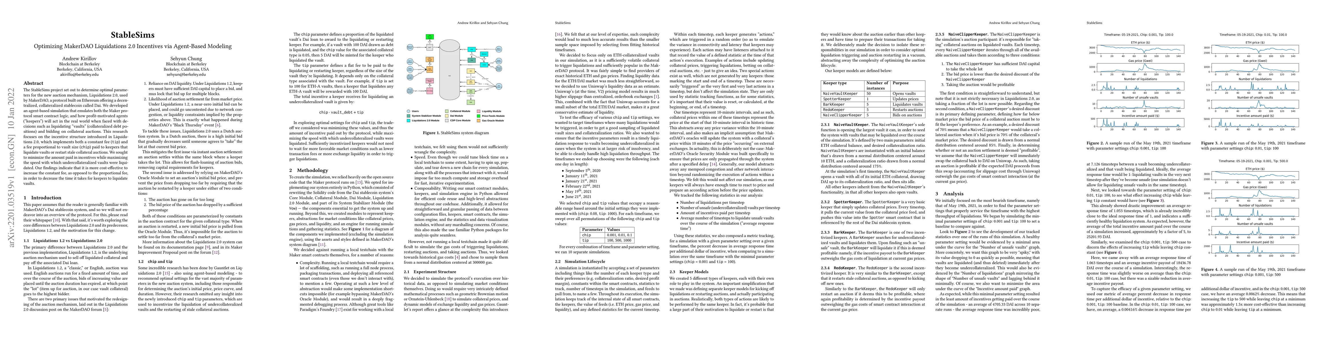 The StableSims project used agent-based modeling to optimize MakerDAO's Liquidations 2.0 incentives, finding that increasing the constant fee is more effective than the proportional fee in speeding up vault liquidations while minimizing incentive costs.