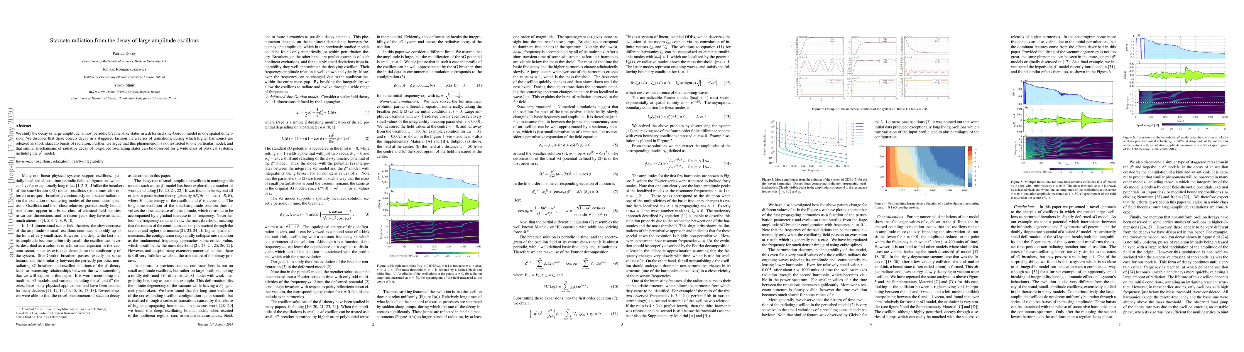 We study the decay of large amplitude, almost periodic breather-like states in a deformed sine-Gordon model in one spatial dimension. We discover that these objects decay in a staggered fashion via a series of transitions, during which higher harmonics are released as short, staccato bursts of radiation. Further, we argue that this phenomenon is not restricted to one particular model, and that similar mechanisms of radiative decay of long-lived oscillating states can be observed for a wide class of physical systems, including the $\phi^6$ model.