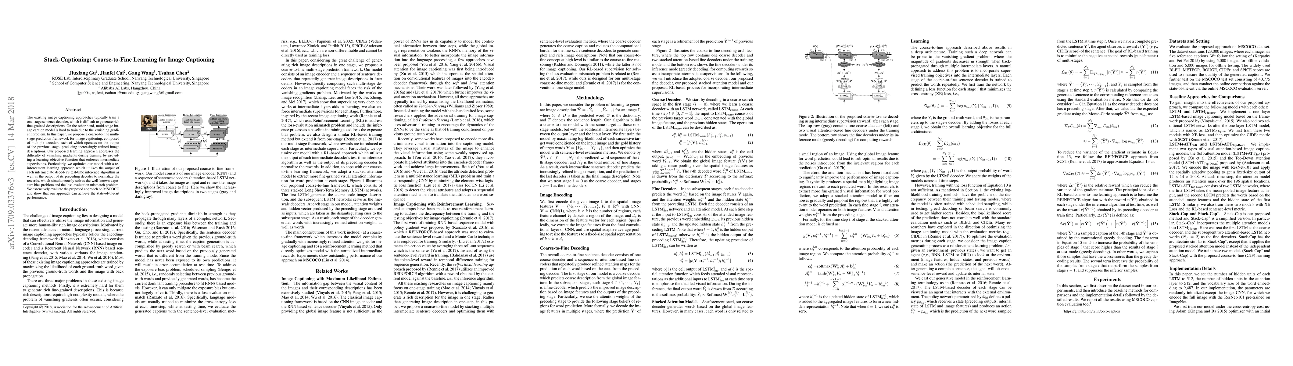 This paper proposes a coarse-to-fine multi-stage learning framework for image captioning that uses a sequence of decoders to generate progressively refined descriptions, addressing vanishing gradient issues with intermediate supervisions and reinforcement learning. The approach achieves state-of-the-art performance on MSCOCO.