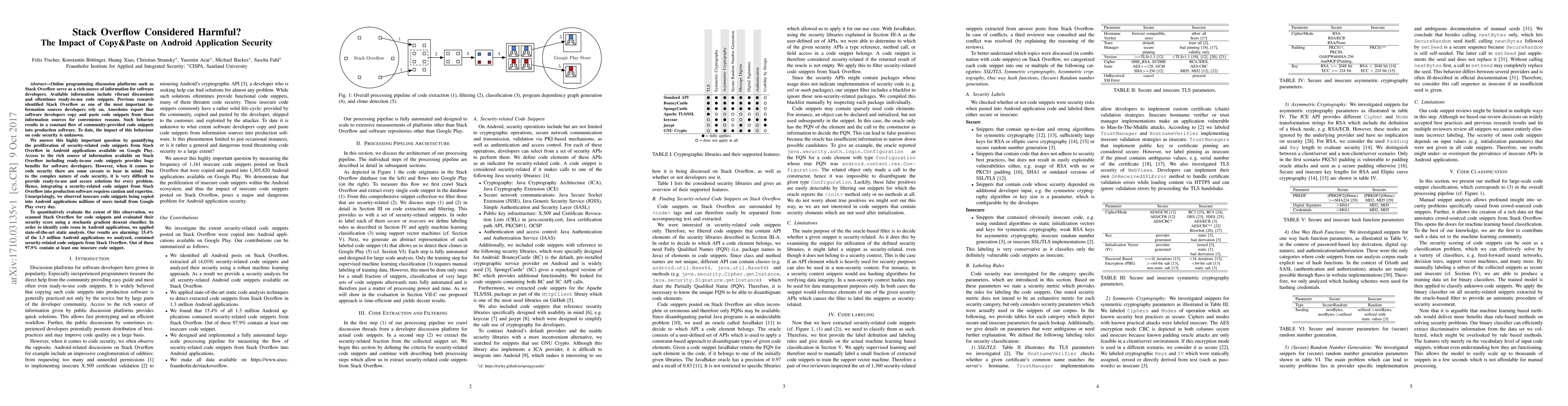 This study investigates the impact of developers copying and pasting code snippets from Stack Overflow into Android applications, revealing that 15.4% of 1.3 million apps on Google Play contain such snippets, with 97.9% of these including insecure code. The findings highlight the need for caution when integrating community-provided code for security purposes.