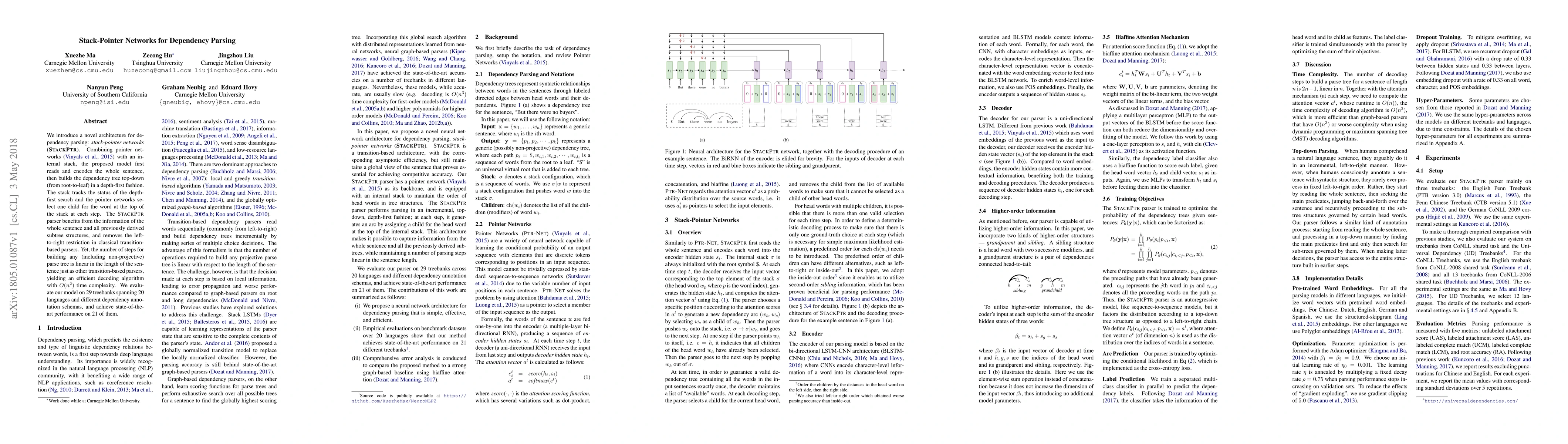 The paper proposes a novel \emph{stack-pointer network} architecture for dependency parsing, which combines pointer networks with an internal stack to build dependency trees top-down efficiently while achieving state-of-the-art performance on 21 out of 29 evaluated treebanks.