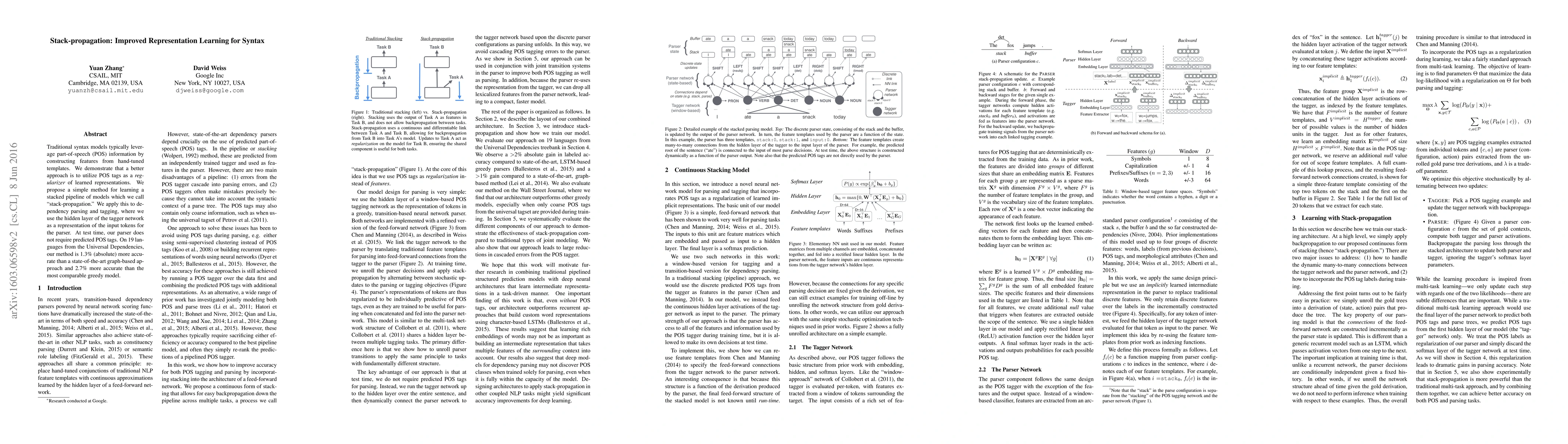 Traditional syntax models typically leverage part-of-speech (POS) information by constructing features from hand-tuned templates. We demonstrate that a better approach is to utilize POS tags as a regularizer of learned representations. We propose a simple method for learning a stacked pipeline of models which we call "stack-propagation". We apply this to dependency parsing and tagging, where we use the hidden layer of the tagger network as a representation of the input tokens for the parser. At test time, our parser does not require predicted POS tags. On 19 languages from the Universal Dependencies, our method is 1.3% (absolute) more accurate than a state-of-the-art graph-based approach and 2.7% more accurate than the most comparable greedy model.