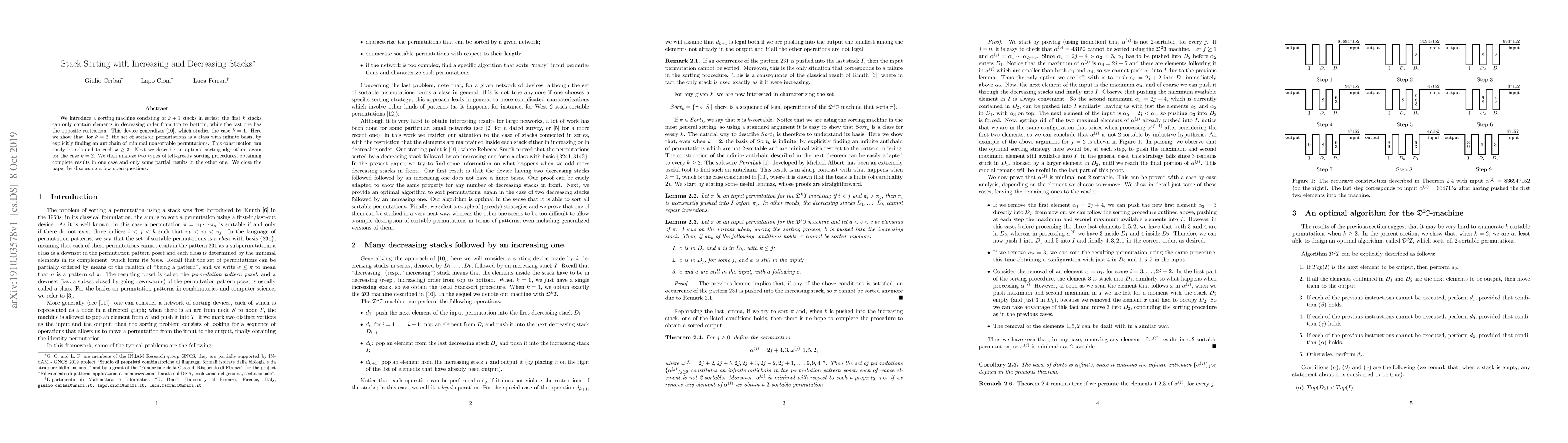 This paper presents a sorting machine with $k+1$ stacks where $k$ stacks maintain decreasing order and the last stack increases. For $k=2$, it identifies an infinite basis for nonsortable permutations and proposes an optimal sorting algorithm. It also analyzes two left-greedy sorting methods, providing complete results for one and partial results for the other.