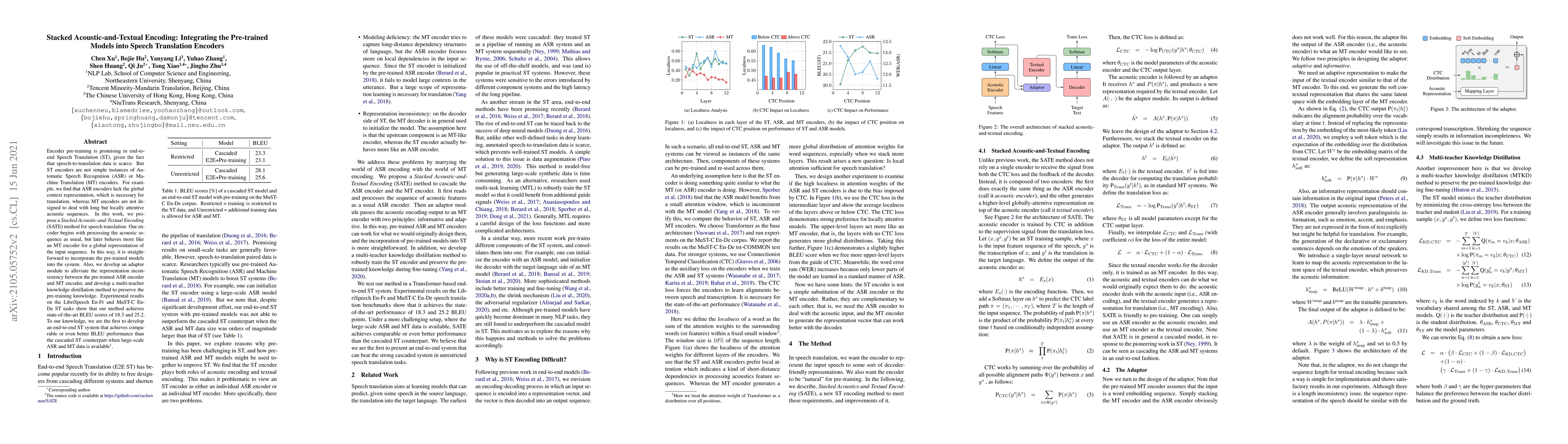 This paper proposes a Stacked Acoustic-and-Textual Encoding (SATE) method for speech translation, integrating pre-trained models to address the scarcity of speech-to-translation data. The method combines acoustic and textual encoding to improve global context representation, achieving state-of-the-art BLEU scores on LibriSpeech and MuST-C tasks.