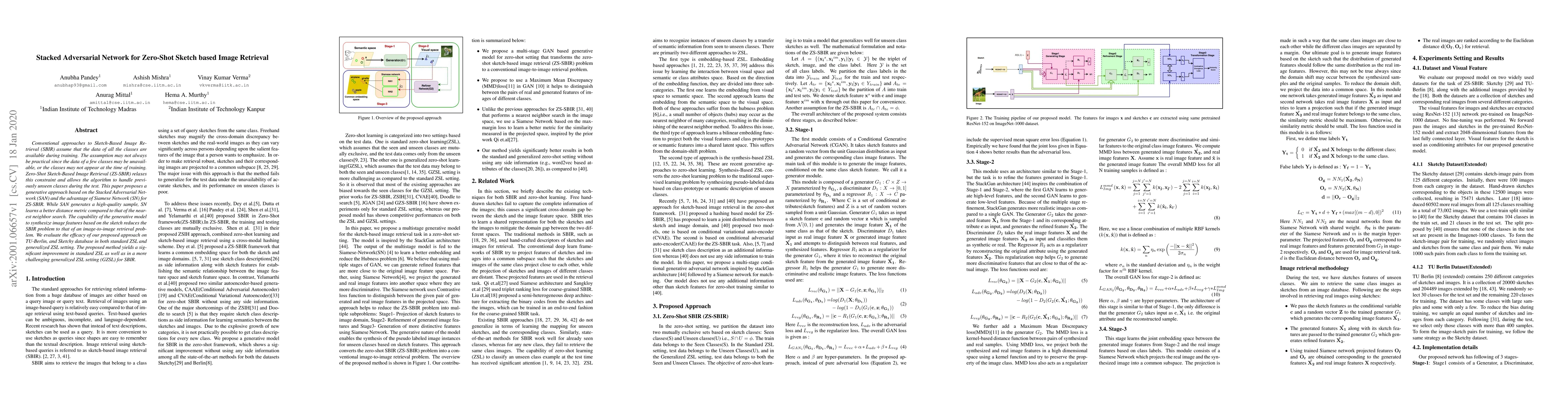 This paper proposes a generative Stacked Adversarial Network (SAN) coupled with a Siamese Network (SN) for Zero-Shot Sketch-Based Image Retrieval (ZS-SBIR), achieving notable improvements over nearest neighbor search and performing well in both standard and generalized zero-shot learning settings.