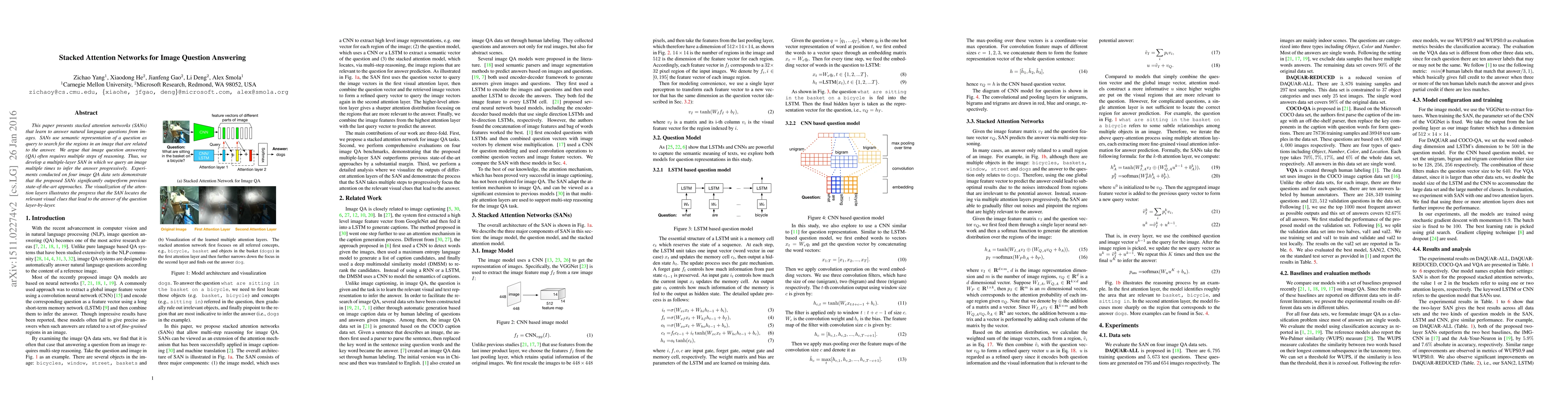This paper introduces stacked attention networks (SANs) that progressively reason through multiple layers to answer natural language questions from images, outperforming previous methods on four image QA datasets. Visualization of attention layers shows SANs progressively identifying relevant visual clues.